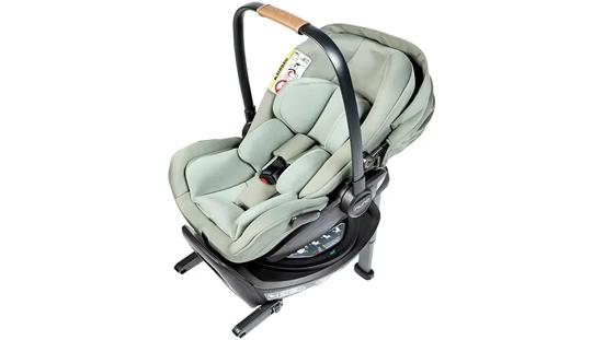 Babystoeltje met Isofixbasis, waarop het zitje zich eenvoudig en snel laat monteren. De meegeleverde basis kan na montage in de auto achterblijven. Met name bij grotere baby’s kan ook het zitje in de auto achterblijven, voor het intillen en vastgespen van de baby kan dan de zitschaal zijwaarts gedraaid worden.
