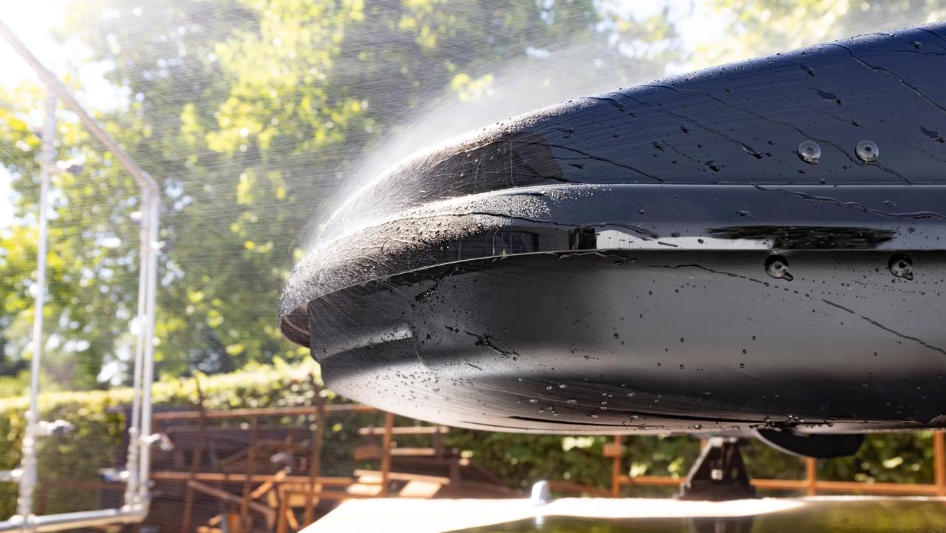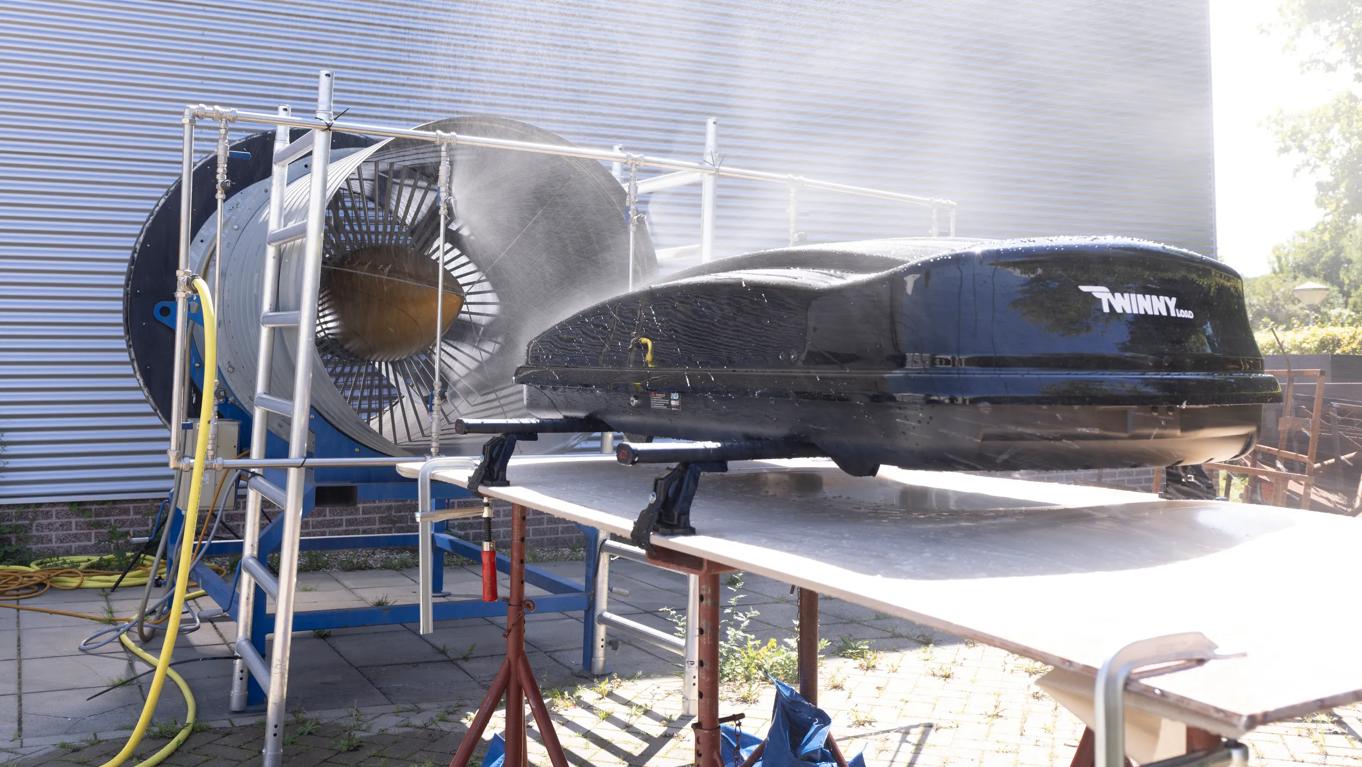 We simuleerden een rit van twee uur door een regenbui met een regen- en windmachine. Vrijwel alle koffers hielden zich goed. De zwakke plekken bleken de goten van de bevestigingssystemen aan de onderzijde van de koffers (bij o.a. Thule, Farad, Twinny Load) en de sloten (Hapro, Atera, Modula). In de meeste gevallen ging het om enkele druppels. Alleen Yakima liet serieuze lekkage zien: zo’n 160 ml via de vergrendelingen. De dakkoffer van Kamei bleef volledig droog.
