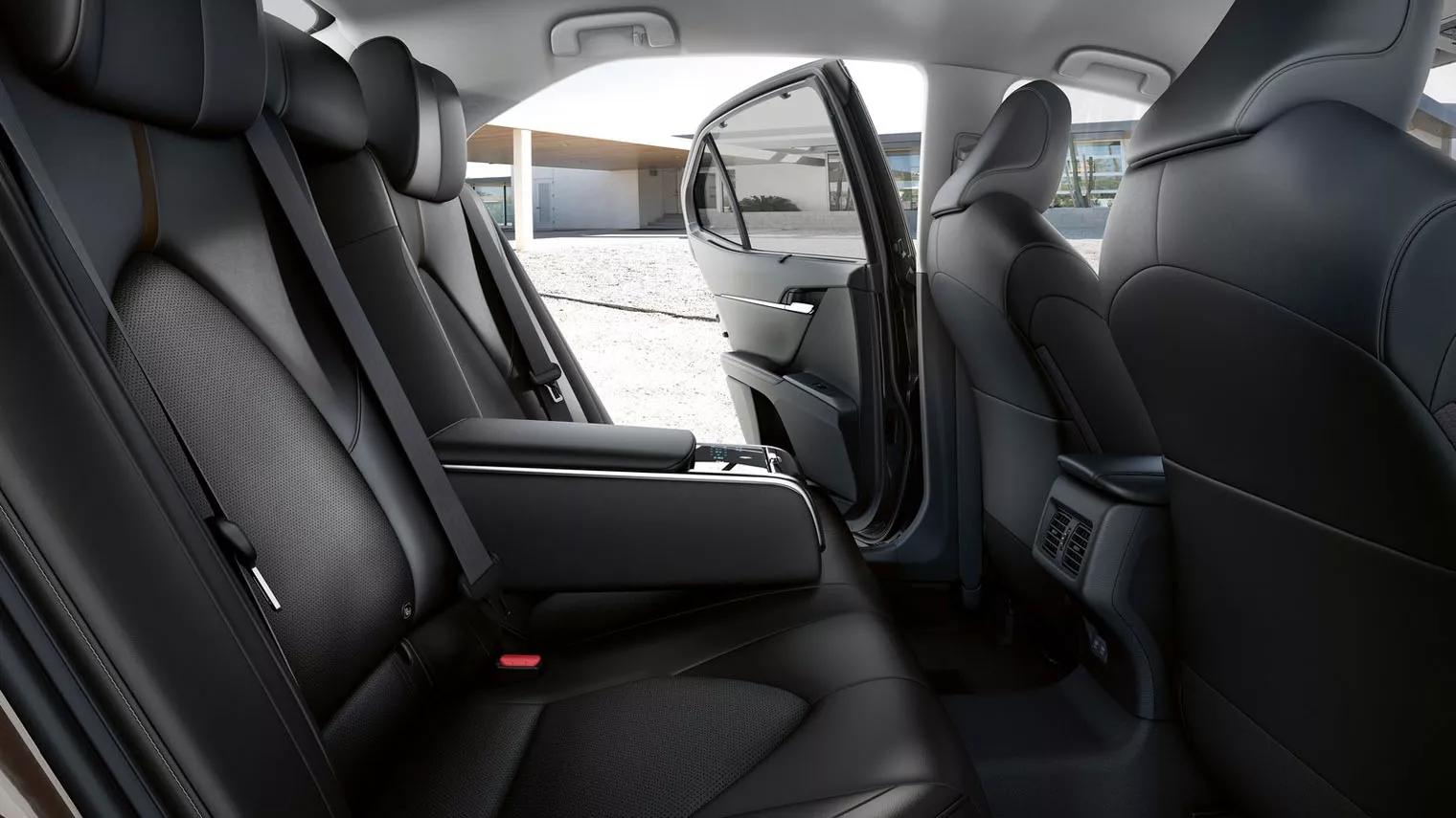 Voor een auto met zo’n lage gestalte, is de zit achter het stuur hoog. Bovendien zijn de stoelen niet bemeten op lange(re) Europeanen: daarvoor zijn zowel de zitting als de rugleuning te kort. Ook het interieur verraadt dat de Camry oorspronkelijk voor de Amerikaanse markt is bedoeld: er worden harde kunststoffen gebruikt en op de middenconsole prijken bovenmaatse bedieningsknoppen in verhouding met het bescheiden formaat van het infotainmentscherm. De binnenzijde van de kofferbak is maar ten delen bekleed; open je het tankklepje, dan blijkt de carrosserie daar niet mee te zijn gespoten. Met een kofferbakinhoud van 524 liter loopt de Camry keurig in de pas met zijn Europese alternatieven, maar klap je de rugleuning van de achterbank neer, dan blijft er in de Toyota maar een beperkte laadopening over. De beenruimte achterin is van een geheel andere orde. Het lijkt achterin wel een limousine! Of de hoofdruimte net zo gigantisch is, hangt af van je lichaamsbouw: ben je boven de 1.90 meter, dan valt die niet meer dan toereikend te noemen. Elke passagier beschikt over zijn eigen stroompunt en luchtstroomopening. De middentunnel is niet te missen, maar het ding is zo breed dat een eventuele derde inzittende hier gemakkelijk zijn benen op kwijt kan.