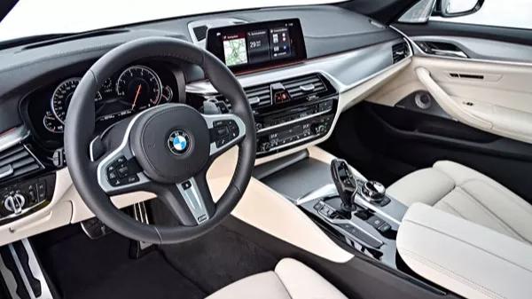Vanwege steeds strengere milieuregels is het inmiddels gebruikelijk om een 5 Serie met een viercilinder motor te bestellen. Merkpuristen geven echter de voorkeur aan een ouderwetse zescilinder, zoals het 265 pk sterke exemplaar onder de motorkap van de nieuwe stationwagen waarmee wij in Zuid-Duitsland konden kennismaken. D e 530d heeft een heerlijk romige dieselmotor die ook nog eens geweldig klinkt. Wees wel behoedzaam bij het accelereren, want de kleinste beweging van je grote teen is al genoeg om een vrachtwagen te passeren. Druk je achteloos het gaspedaal in, dan deelt de BMW een ongenadige duw in je rug uit. Die is voor jou al vervelend, laat staan voor je passagiers, die zo'n plotselinge versnelling al helemaal niet zullen zien aankomen. De autofabrikant werkt tegenwoordig met aluminium en sterkere staalsoorten, waardoor het gewicht van de Touring met 100 kilo is afgenomen (alleen de kofferklep weegt al 4,5 kilo minder). Bovendien ontwikkelden de ingenieurs een compleet nieuw onderstel. Beide zaken resulteren in een lichtvoetig rijkarakter, dat helaas hinder ondervindt van de luchtvering die op de achteras van de stationwagen wordt meegeleverd. Voorheen was dat een extra, tegenwoordig behoort het tot de standaarduitrusting. Luchtveren maken de 5 Serie beweeglijker dan de sedan, die stalen exemplaren heeft. En zelfs in die mate, dat je er de kinderen gemakkelijk misselijk mee kunt rijden wanneer de wegen uitdagender worden. Het klinkt tegenstrijdig, maar je kunt de Touring onder zulke omstandigheden nog het beste in de sportstand rijden: dan wordt het deinen tot een minimum beperkt, al valt het alsnog aan te raden je tempo in de gaten te houden. Dat is overigens geen straf: bij normaal gebruik is de BMW een fantastische reisauto, imponerend stil en met een achttraps automaat die zijdezacht van verzet wisselt. Hoewel de luchtvering ons in de heuvelachtige omgeving van München noopte tot een behouden rijstijl, brengt de voorziening het voordeel met zich mee dat de Touring met tot wel 730 kilo mag worden beladen. En dat is dan alleen nog het gewicht dat je aan bagage in de kofferbak kun stoppen; onze testversie mag ook nog eens een aanhanger van maximaal 2.000 kilo trekken. De beschikbare veiligheidsuitrusting komt één-op-één van de 7 Serie. Die limousine was in 2015 de eerste BMW met rijhulpsystemen als actieve rijstrookassistentie en adaptieve cruise control, waardoor de auto zelfstandig kon rijden in fileverkeer. De 5 Serie kan dat nu ook, maar je merkt aan de grote middenklasser dat dit soort techniek nog relatief nieuw voor de Duitsers is. De BMW houd je weliswaar netjes tussen de lijnen van je rijbaan, maar de stuurbewegingen die daarvoor nodig zijn, voelen bij de Mercedes E-Klasse vloeiender aan. Overigens geven de BMW-ingenieurs hun concurrenten geen duimbreed toe; net als die E-Klasse kan ook de 5 Serie zelfstandig van rijbaan wisselen (alleen staat de Nederlandse wetgeving dat op het moment van schrijven nog niet toe). En ook de BMW kun je inparkeren terwijl je zelf naast de auto staat: een geweldige goocheltruc, maar de bediening is omslachtig en in de dagelijkse praktijk zal je er vermoedelijk nauwelijks gebruik van maken. Wanneer je zo’n mooie auto hebt, zou je toch gek zijn om hem moedwillig in een krappe parkeerplek te manoeuvreren?De BMW 530d Touring van binnen