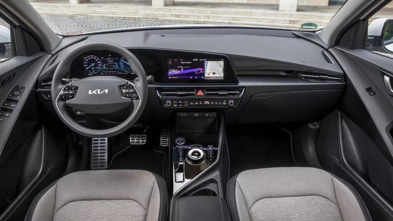 De Kia is aan alle kanten een paar centimeter gegroeid. De kofferbakinhoud nam met 25 liter toe tot minimaal 475 stuks, waarmee de EV de grootste bagageruimte biedt van alle beschikbare motorvarianten. Bovendien heeft de elektrische Niro voortaan een ‘frunk’: een extra opbergmogelijkheid onder de motorkap. Vanwege het aanwezige batterijpakket is de achterbank anders gepositioneerd, wat langere volwassenen kostbare centimeters hoofdruimte kost. Vanaf het tweede uitrustingsniveau kun je de rugleuning verstellen. De beenruimte valt even goed in de smaak, net als de ontbrekende middentunnel, de stroompunten aan de zijkant van de voorstoelen en een heus stopcontact voor de inzittenden achterin, compleet met kinderslot. Het interieur van de Niro doet sterk aan dat van de eerder aangehaalde EV6 denken, met zijn futuristische stoelen en een digitaal knoppencluster dat voor meerdere functies te gebruiken valt. Je kunt de duurste uitvoering van de Niro eveneens als mobiele batterij inzetten: de crossover geeft dan stroom uit de batterij terug om andere apparaten mee op te laden, tot de EV van je buurman aan toe.