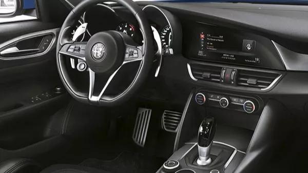 De rijeigenschappen van de Veloce zijn misschien wel de belangrijkste reden om deze auto te kopen. De combinatie van de gehele aandrijflijn (motor en achttraps automaat samen dus) en het onderstel is geweldig. Vergeet niet dat alle Giulia’s zijn afgeleid van de ultrasterke Quadrifoglio-versie. Oftewel, het onderstel en wat dies meer zij kan 510 pk aan, dus met de krachten die vrijkomen bij 280 pk heeft het geen enkele moeite! De Veloce voelt lichtvoetig en stuurt direct en erg precies. Vooral in de D(ynamic) stand is de auto lekker levendig - in N is hij mooi comfortabel voor een lange snelwegrit. In de D-stand reageert de motor alerter en schakelt de bak op andere momenten. Bovendien wordt de afstemming van het onderstel straffer. Onze testauto heeft een Active Suspension pakket en het mooie daarvan is dat je dan in de D-stand de harde demping kan uitzetten, maar de auto voor de rest even gretig blijft aanvoelen. De lichtvoetigheid komt verder ook door veelvuldig gebruik van lichte materialen zoals aluminium en zelfs koolstofvezel. De Giulia Veloce heeft standaard vierwielaandrijving maar voelt meestentijds als een achterwielaandrijver. Alleen als de achterwielen grip verliezen vloeien er ook (tot maximaal 60 procent) aandrijfkrachten naar de voorwielen. Onder normale omstandigheden is het dus een 100 procent achterwielaandrijver en voel je dus ook geen aandrijfreacties in het stuurwiel. Het Q4-systeem betekent een gewichtstoename van 60 kilogram maar met 280 pk onder de motorkap merk je daarvan helemaal niets. In de Dynamic stand laat de Veloce, met het ESP ingeschakeld, toe dat de achterkant een beetje kan uitbreken. Superleuk als je de auto met het gaspedaal wilt sturen. Wat het rijden verder aangenaam maakt is de standaard aanwezige 8-trapsautomaat van ZF. Die schakelt pijlsnel. Verder zijn er optionele lichtmetalen 19-inchwielen gemonteerd. Door de lage wangen van de banden voel je heel goed wat er gebeurt onder de wielen - al lever je wel wat in op veercomfort. Maar oncomfortabel wordt het nooit. Het verbruik van de viercilinder turbomotor blijft keurig binnen de perken, zijn enorme potentieel in aanmerking genomen. We haalden een gemiddeld testverbruik van 1 op 10,7, waarbij een zeer snelle Autobahn-rit is meegerekend. Op die Autobahn bleek dat er ook boven de 200 km/h nog veel leven in de krachtbron zit. Tot 220 km/h trek hij stevig door, daarboven neemt de acceleratie af. We bereikten uiteindelijk 233 km/h op de teller (Alfa Romeo geeft een top op van 240 km/h). Op die snelheid voelt de auto nog steeds rustig en stabiel aan. De krachtbron is onder meer uitgerust met een zogeheten twinscroll turbo. Simpel gezegd komt het er op neer dat de turbo aan de kant waar hij door de uitlaatgassen wordt aangedreven, twee sets schoepen heeft van verschillende afmetingen. Bovendien worden de uitlaatgassen niet als één luchtstroom, maar als twee gescheiden luchtstromen naar de turbo geleid. Hierdoor ontstaat een pulserend effect. Het gevolg is dat de turbo al bij lage toeren meewerkt, veel druk kan leveren en dat er geen voelbaar turbogat is.De Alfa Romeo Giulia Veloce van binnen