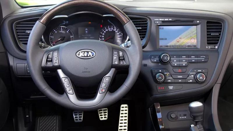 Wij rijden de diesel met handgeschakelde zesbak. De motor pakt goed op. En die blijft over de gehele linie redelijk stil. Maar op snelheid heeft hij wel iets meer moeite om deze 1.600 kilogram zware Optima nog een extra zetje te geven. De automaat hadden we al eens eerder gereden. Die kun je trouwens ook zelf schakelen met flippers achter het stuur. Alleen is die niet van het meest moderne type. Maar hij doet zijn werk verder naar behoren. In bergachtig terrein valt de handelbaarheid van deze toch forse sedan meteen op. Hij stuurt met het grootste gemak door de scherpe bochtjes. Het overhellen blijft daarbij achterwege. Verder is de (elektrisch bekrachtigde) besturing licht, maar gelukkig nog wel met enig gevoel. Voorts voelt het onderstel stevig en gelijktijdig comfortabel genoeg aan. Nu is het onderstel van een Europese Optima anders afgesteld dan een Amerikaanse. En dat is te merken. Hij is gelukkig niet te week. Op de snelweg spoort deze Kia als de spreekwoordelijke trein. Je kunt comfortabel vele kilometers afleggen zonder moe te worden. Hij voelt echt heel volwassen aan, deze Optima. Alleen moet de motor er wel een beetje aan trekken om dit 1.600 kilogram zware slagschip op snelheid te houden.De Kia Optima van binnen