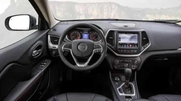 Tegenwoordig zwaait Fiat de scepter bij Jeep. Toch is deze Cherokee nog steeds een Amerikaanse terreinwagen, met een lastig te doseren gaspedaal en de daaruit voortvloeiende, abrupte starts. De 3,2-liter V6 uit de Trailhawk-uitvoering is gekoppeld aan een automaat met negen versnellingen. Die doet haast traploos zijn werk en draagt zo bij aan de vliegende tapijt-beleving aan boord. Korte tussensprintjes met behulp van de cruise-control (je rijdt 100- en wilt 120 km/h gaan rijden) verlopen juist wat onbeholpen; de bak schakelt nadrukkelijk terug en de acceleratie verloopt bruusk. De Trailhawk kent vijf rijstanden, waarvan er twee uitsluitend zijn bedoeld voor in het terrein. In de sportmodus schakelt de automaat nog oncomfortabeler; hij zet bovendien een enorme keel op voordat hij versnelt. De wagen komt weliswaar rap van zijn plek, maar weegt ruim 2.000 kilogram. In combinatie met de lichte besturing heb je nauwelijks een idee waar hij met alle geweld naar toe wil. De Jeep rolt ook ontzettend uit. Hij bevalt nog het beste wanneer je rustig aan doet. Nadelen als de slecht gedempte achterzijde (van een verkeersdrempel geniet je nog even na in de Cherokee) en het nadrukkelijke windgeruis vallen dan minder op. Alleen het beperkte zicht over je schouder blijft behelpen.De Jeep Cherokee Trailhawk van binnen