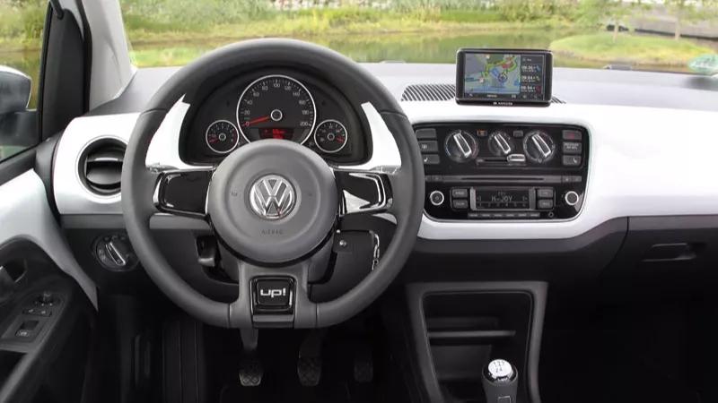 Compacte auto's hebben doorgaans niet de beste rijeigenschappen. Veercomfort en stabiliteit zijn vaak niet optimaal. Bij de Up! valt het erg mee en dat komt onder andere door zijn relatief lange wielbasis (de afstand tussen voor- en achteras) van 2,42 meter en de op comfort afgestelde vering en schokdemping. In de stad is de Up! vlot handelbaar en wendbaar en op de snelweg heb je nooit het gevoel dat je daar eigenlijk niks te zoeken hebt (zoals bijvoorbeeld met de smart). Met de eenliter driecilinder met 75 pk kun je prima meekomen met het verkeer. Of dat voor de 60 pk versie ook geldt hebben we nog niet kunnen uitproberen. In elk geval viel wel op dat het driecilindertje erg mooi draait: stil en trillingvrij. Vermeldenswaard is verder dat de Up! met een aantal belangrijke veiligheidsmiddelen kan worden uitgerust. ESP uiteraard, maar ook met een noodremsysteem. Een lasersensor houdt voortdurend de weg voor je in de gaten. Bij snelheden tot 30 km per uur remt de Up! dan automatisch als je ergens tegenaan dreigt te rijden.De Volkswagen Up! van binnen