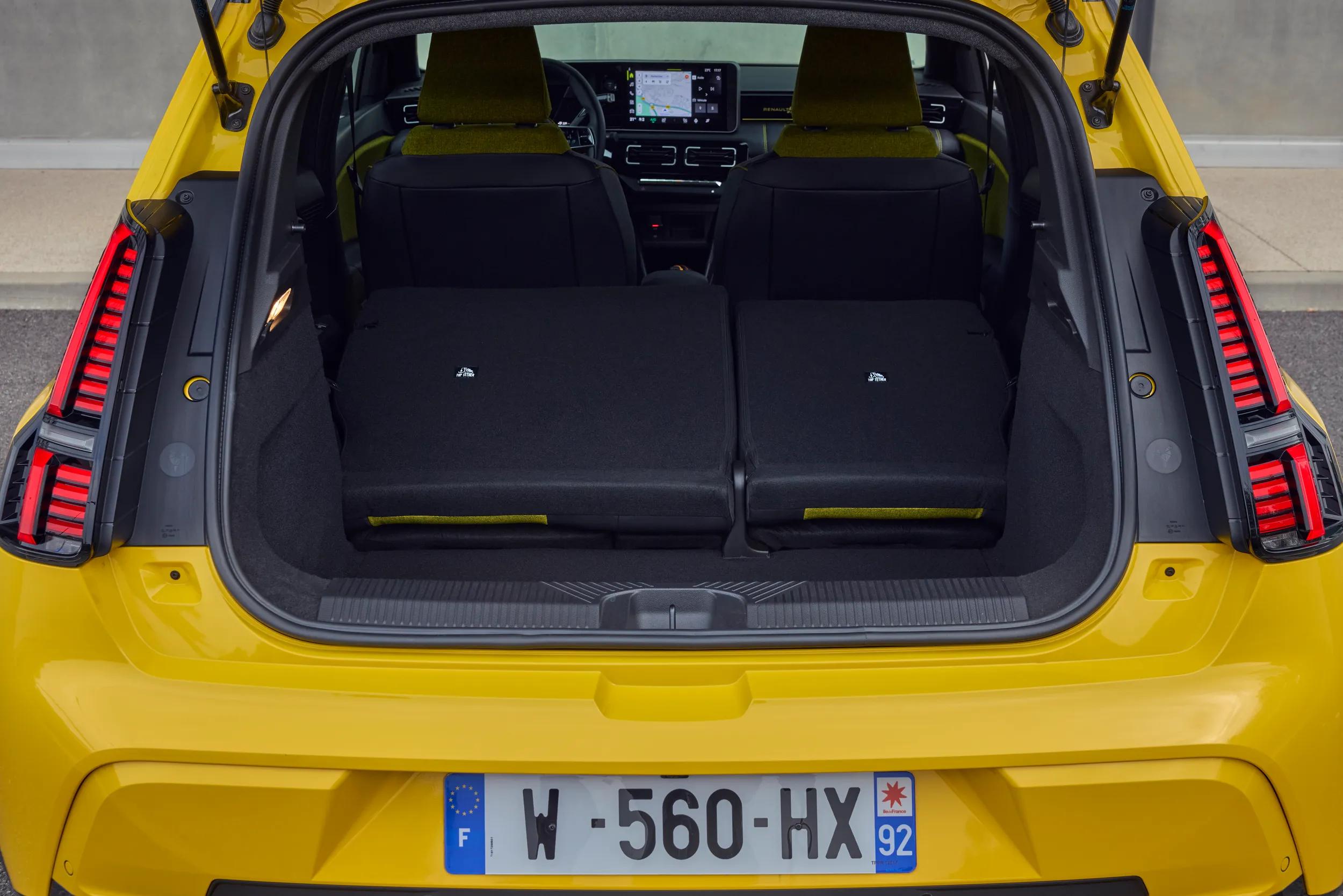 De kofferbak van de kleine Renault is verrassend groot, met een inhoud van minimaal 326- en maximaal 1.000 liter. Daar kan de concurrentie niet aan tippen. Helaas heeft de 5 een hoge tildrempel en ontbreekt een variabele bagagebodem. Daardoor ontstaat er geen vlakke laadvloer. Onder de bodem is er wel een vak om je laadkabel op te bergen. De Renault heeft geen opbergruimte voorin; onder de oorspronkelijke motorkap vinden we daadwerkelijk de krachtbron.
