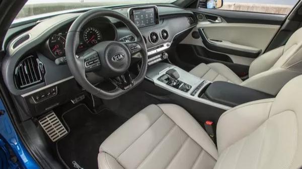 De Optima waarop de Stinger is gebaseerd, wordt gezien als een grijze muis. Dat neemt niet weg dat het een prima auto is. In de zomer van 2016 reden we met de huidige generatie, die we als comfortabel en compleet beoordeelden. Zeker gezien zijn prijs. Dat criterium gaat voor de Stinger niet op, want voor het bedrag dat voor de eenvoudigste versie is verschuldigd, kun je zowat twee Optima’s kopen. Wij hielden het dan ook bij het ‘instappertje’; een 200 pk sterke dieselvariant met 440 Nm koppel en een trekgewicht van 1.500 kilogram (wat opvallend genoeg 300 kilo lager ligt dan dat van de eenvoudigste Optima diesel). Hij mag dan de bulderende V6 uit de televisiereclames ontberen, de goedkoopste Stinger is wel degelijk uit hetzelfde hout gesneden als de posterheld. Je profiteert van een uitmuntende zitpositie, heerlijke sportstoelen en een onderstel dat niet vies is van een robbertje stoeien. Dat Kia tegenwoordig auto’s bouwt met de juiste mate van gevoel in de besturing, hadden de Koreanen al laten zien met hun compacte crossover de Sportage. De Stinger gaat nog een stapje verder met een snelheidsafhankelijke stuurbekrachtiging die precies doorgeeft wat de 18-inch wielen doen. Hoewel ze aan de buitenzijde niet eens overdreven groot ogen, merk je achter het stuur dat 17-inch exemplaren niet hadden misstaan: de vierdeurs coupé kan zijn flinke bandenmaat slecht verhullen. Daar staat tegenover dat het indrukwekkend stil is aan boord. Menig alternatief is slechter geïsoleerd. Wie niet wil planken, kan met de grote Kia dus ook voortreffelijk toeren. De 2.2-liter dieselmotor beschikt over genoeg vermogen om onder alle omstandigheden te presteren, daarbij geholpen door een plezierige achttraps automaat. De enige wanklank - en in dit geval mag je dat letterlijk nemen - is de hinderlijke ‘dreun’ die in de testauto te horen viel bij een toerental onder de 1.500 stuks. De resonanties gaan de hele auto door en dat doet afbreuk aan het rijcomfort. Net als de beoogde concurrentie beschikt de Stinger over verschillende rijmodi, die bijvoorbeeld hun weerslag hebben op de mate van demping en gasrespons. Bijzonder is dat daarbij ook een stand zit, waarin de auto zich aan jóuw rijstijl aanpast (in plaats van andersom). Dat zie je niet vaak, zoals het ook opvallend te noemen valt dat Kia de Stinger standaard voorziet van een uitgebreid pakket aan rijhulpsystemen. Actieve rijstrookassistentie, adaptieve cruise control, vermoeidheids- en verkeersbordherkenning, een noodremsysteem, head-up display en dode hoek signalering zijn al vanaf de eenvoudigste uitvoering aan boord. Het is maar goed dat ook een 360 graden camera deel uitmaakt van de standaarduitrusting, want vanwege het kleine glasoppervlak en de dikke raamstijlen valt de auto slecht te overzien.De Kia Stinger 2.2 CRDi van binnen