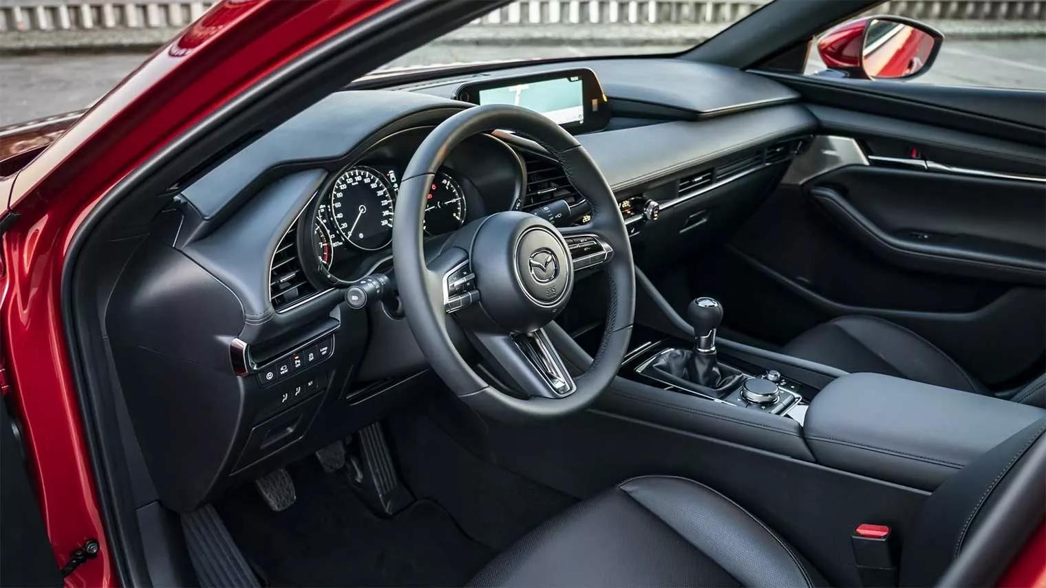De voor-inzittenden genieten van bijzonder goede en fijne voorstoelen, met een heel groot verstelbereik, dat is ideaal voor lange of juist kleine mensen. De stuurkolom is eveneens ruimschoots te verstellen. Het instrumentarium is erg fraai, gedeeltelijk digitaal, de rest van het dashboard is vooral erg mooi afgewerkt. Handig: bij de brandstofvoorraad staat de gecalculeerde resterende actieradius. De 3 stuurt erg prettig, het veercomfort is stevig, maar niet te hard, op het sportieve af. De handgeschakelde versnellingsbak schakelt voorbeeldig, maar de automatische transmissie maakt van de 3 in dagelijks gebruik een nog fijnere auto.
