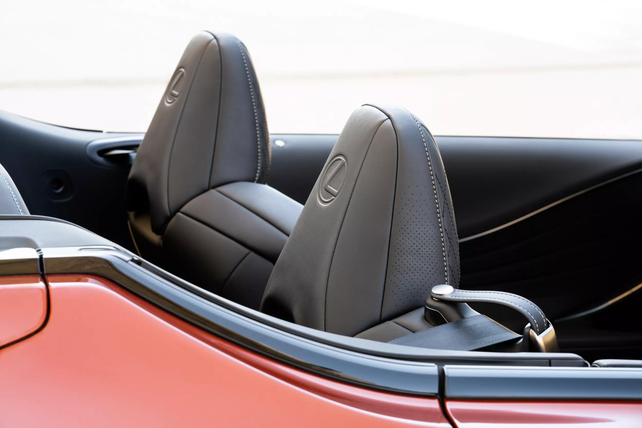 De stoelen van de LC zijn voorzien van een verwarmingssleuf onderaan de hoofdsteun: die blaast warme lucht in je nek, zodat je ook bij guur weer open kunt rijden. Helaas schakelt die functie zichzelf na gebruik niet uit; hetzelfde geldt voor de stoelverwarming. De volgende keer dat je instapt, kan het weer echter zijn omgeslagen. Heb je het in enen bloedheet aan boord!