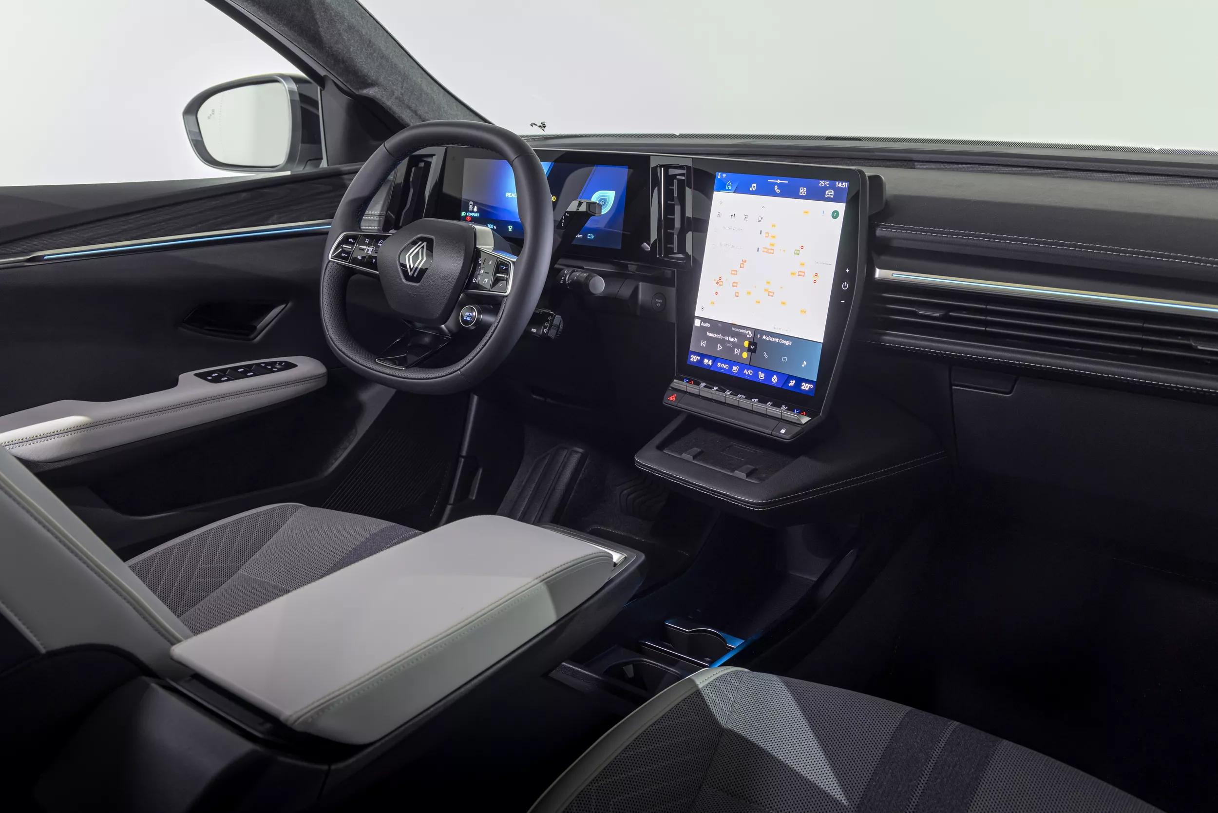 Onze testauto was een zogenaamde Esprit Alpine: een uitrustingsniveau dat je alleen kunt bestellen in combinatie met 87 kWh aan accucellen. De betreffende Scénic ziet er daarnaast wat sportiever uit, je profiteert van stoel- én stuurwielverwarming en het interieur bevat tal van blauwe accenten (inclusief de vloerbedekking!). Voor de speciale middenarmsteun en het grote infotainmentscherm - met een besturingssysteem van Google - kun je al vanaf de een-na-goedkoopste uitvoering terecht: dat kost je weliswaar € 2.500 extra, maar da’s een schijntje in vergelijking met de meerprijs van 6.300 euro die je voor de Esprit Alpine-versie verschuldigd bent.