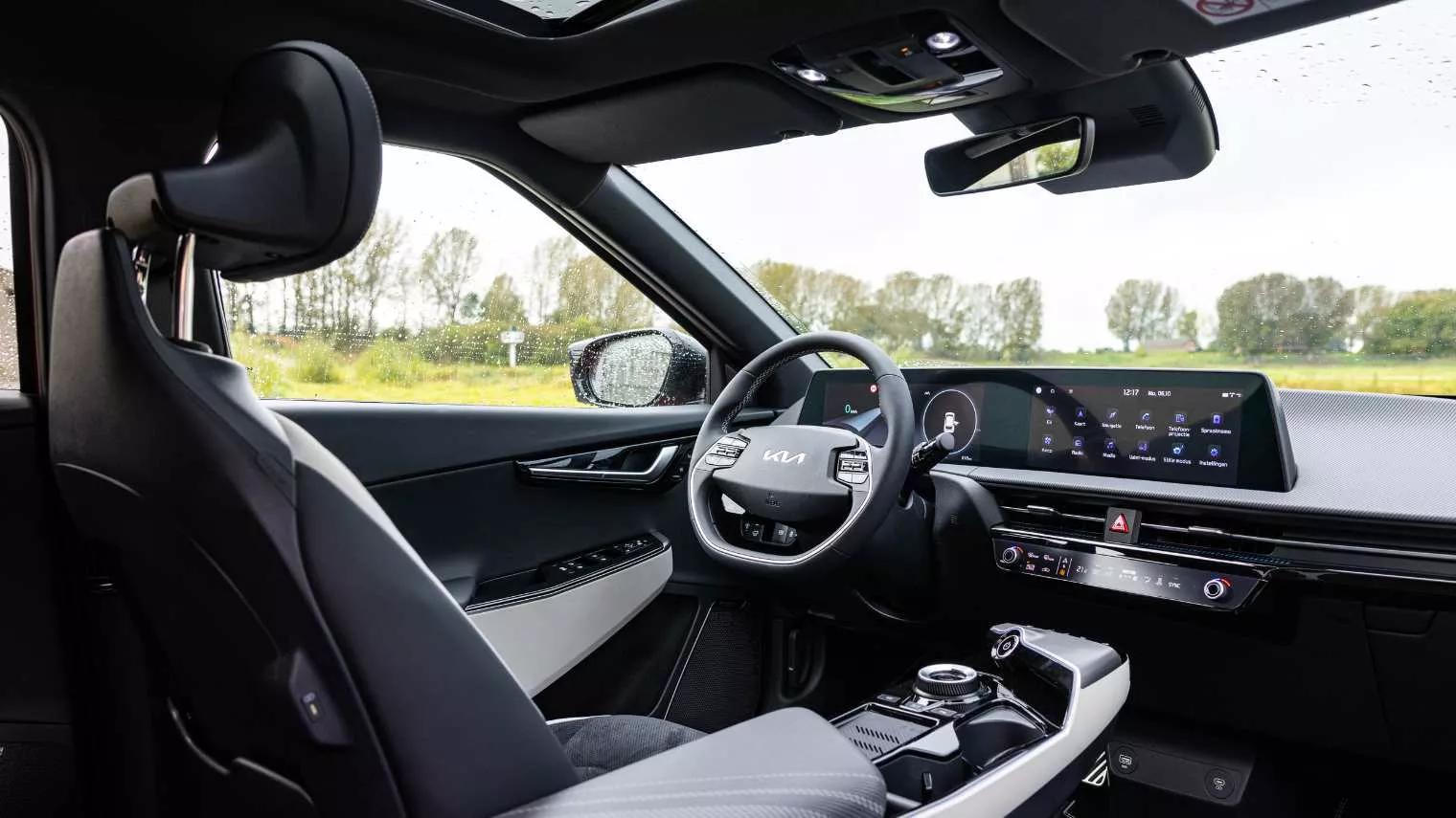 Op basis van zijn uiterlijk verwacht je van de Kia wellicht het prestatiepotentieel van een sportwagen. Dat is zeker het gevoel dat de auto achter het stuur oproept, met een lange neus die zich voor je uitstrekt. De EV6 is ook nog eens achterwielaangedreven, maar met 229 pk en 350 Nm koppel in combinatie met een leeggewicht van 1.900 kilogram kunnen we de Koreaan hooguit ‘vlot’ noemen. Wie bij het verkeerslicht graag in zijn stoel wordt gedrukt, is beter af met een vierwielaangedreven versie. Die is namelijk goed voor maar liefst 325 pk en 605 Nm koppel. Het trekgewicht blijft ongeacht de gekozen aandrijfvorm gelijk met 1.600 kilogram. Door de bank genomen is de EV6 RWD vooral een goede allrounder, met een communicatieve besturing en een onderstel dat het midden houdt tussen sportief en comfortabel. Wie langer is dan gemiddeld, doet er verstandig aan af te zien van de door ons gereden GT-Line variant. In dat geval heb je namelijk standaard een schuifdak aan boord, dat kostbare centimeters hoofdruimte afsnoept. Verder heeft de Kia kleine raampjes en tot overmaat van ramp ontbreekt een achterruitenwisser. Bij slecht weer moet je de EV6 op de spiegels rijden, alsof het een bestelbus is! Gelukkig heeft de gezinswagen een rijke aanvullende veiligheidsuitrusting. Zaken als een achteruitrijcamera, een waarschuwing voor kruisend verkeer en een noodstopsysteem met voetgangers- en fietsersdetectie zitten bij de vanafprijs inbegrepen. Dode hoek bescherming, een head-up display en de mogelijkheid om de elektrische Kia op de snelweg autonoom te laten rijden, zijn voorbehouden aan een duurder uitrustingsniveau.