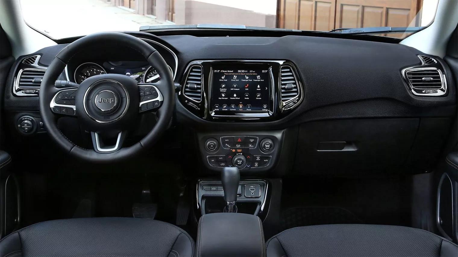 Het interieur is lekker ruim, de bagageruimte bedraagt minimaal 458 liter: niet slecht, maar iets krapper dan verwacht. Opmerkelijk is dat de middenarmsteun van de achterbank tevens dient als ‘skiluik’. Voorin staan twee prima stoelen. Het dashboard met veel zwart kunststof is keurig verzorgd, met in het midden een naar hedendaagse begrippen al bescheiden display voor onder meer navigatie, achteruitrijcamera, audio en airco. Opmerkelijk is dat een aantal functie niet op dat beeldscherm als ‘touchscreen’ is te bedienen, maar met aparte knoppen eronder. Op de weg is de Compass stevig geveerd, vooral kleine oneffenheden worden relatief hard doorgegeven. Het is uiteraard gen sportwagen, maar de Compass biedt achter het stuur al gauw een vertrouwenwekkend gevoel, zo van: ‘kom maar op, je kunt het zo gek niet maken, of ik loods je er wel doorheen’.