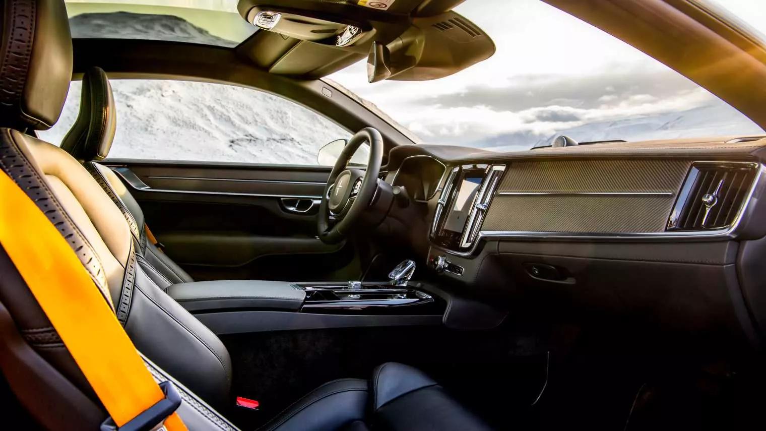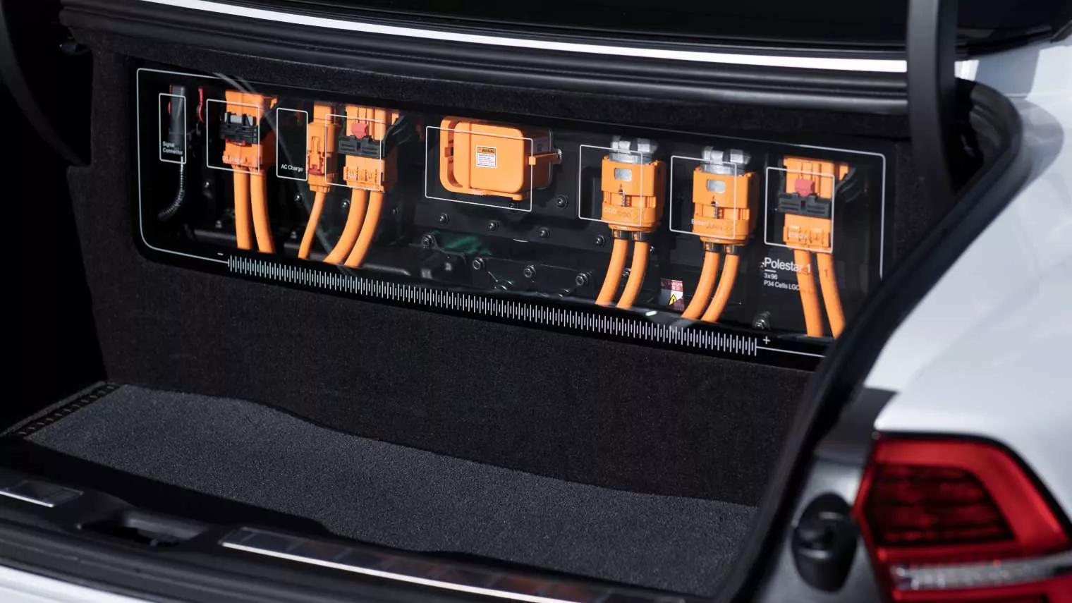 Op het embleem van het stuur na, zou je zweren dat je in een moderne Volvo hebt plaatsgenomen, wanneer je de deur van de Polestar achter je dicht trekt. Daar is overigens weinig mis mee, want de ergonomie van hedendaagse Volvo’s geldt als een van de beste op de markt. Het aanraakscherm waarop je de meeste functies bedient, werkt intuïtief als de tablet die bij de meeste mensen op de koffietafel ligt. De voortreffelijke stoelen zouden ook niet in je woonkamer misstaan. De achterbank van de 1 is er alleen voor de sier, maar daar hebben de Zweden dan ook een waar kunststukje van gemaakt. De zitplaatsen – of extra bergruimte; daarover later meer – zijn bekleed met een contrasterende kleur leder en worden door een sierlijst met de rest van het interieur verbonden. Opvallend zijn de goudgele veiligheidsgordels: die in het oog springende kleur keert ook aan de buitenzijde terug en is een eerbetoon aan het bedrijf waarvan Volvo al sinds jaar en dag zijn dempers betrekt. In het geval van de Polestar kun je die zelfs handmatig verstellen (al heb je voor de achterste exemplaren dan wel een flinke krik nodig). Een dergelijk stuk gereedschap past niet in de kofferruimte, want de inhoud daarvan is zo klein, dat Polestar geen officiële cijfers bekend maakt. Als goedmakertje voor het beperkte gebruiksgemak is de bagageruimte omgetoverd in een soort toonzaal, waar de batterijen in te kijk liggen. Het doet denken aan klassieke sportwagens, die hun tien- en twaalfcilinder verbrandingsmotoren onder een doorzichtige motorkap tentoonstellen. Als het al zou kunnen, zou ‘t zonde zijn om daar je boodschappentassen voor te zetten.