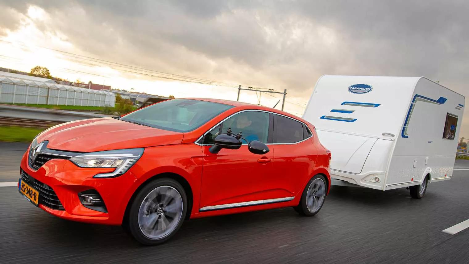 Er mag 900 kg achter de Renault, zowel van de fabrikant als volgens het ANWB-advies. Dat is een keurige massa, waar hij prima mee overweg kan. Opvallend is dat waar bij concurrenten de maximale trekkracht al zo rond de 1.500 rpm beschikbaar is, de Clio-motor daarvoor 2.750 rpm moet draaien. Ook met een caravan erachter gaat de kleine gezinsauto snaarstrak door de bochten. Helaas laat de rechtuitstabiliteit te wensen over, met name bij spoorvorming. Ook is de combinatie gevoelig voor zijwind. De compacte Renault slaat als caravantrekker zeker geen gek figuur, toch zien we ‘m eerder als trekauto voor een forse vouwwagen.