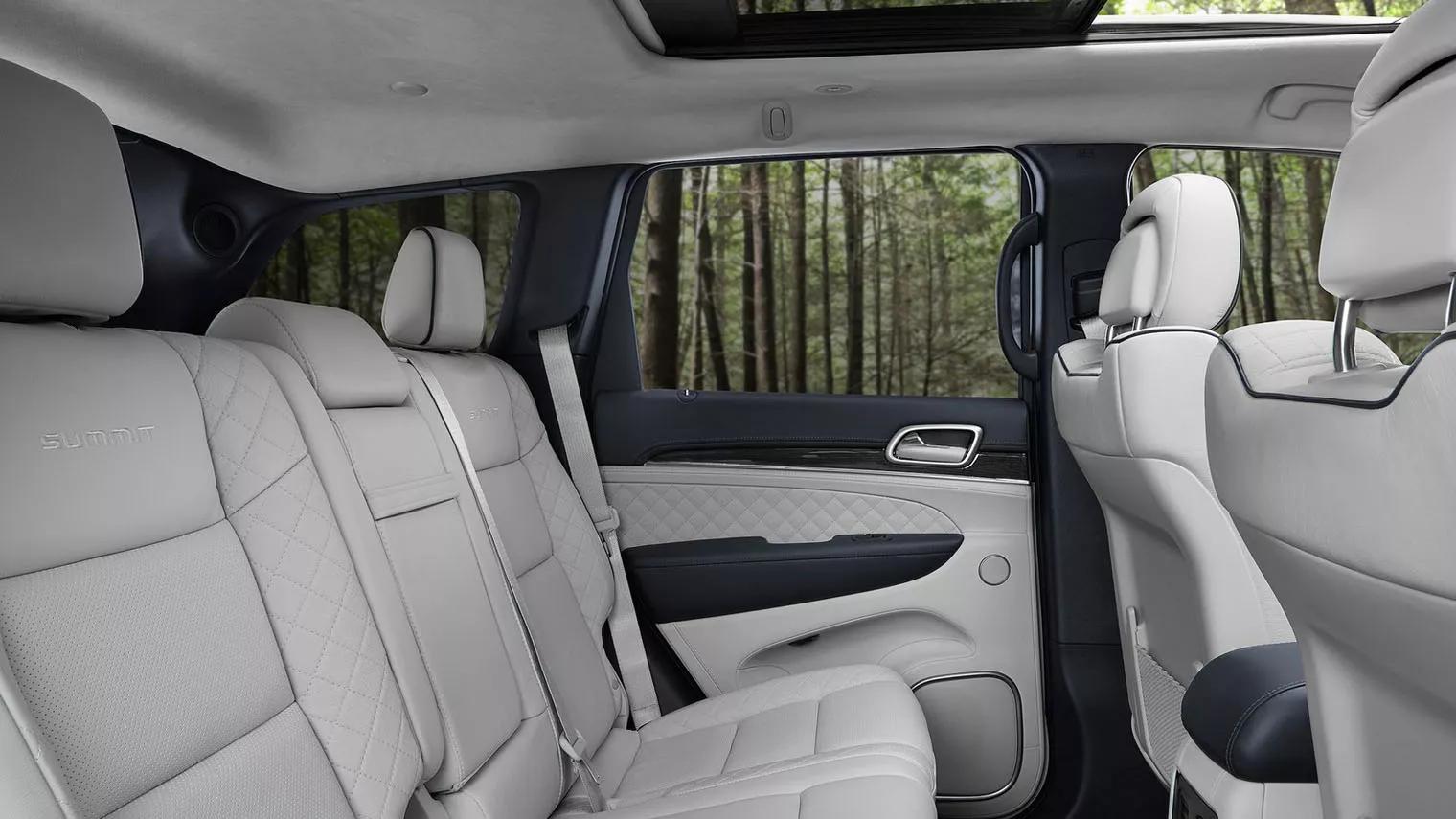 Een houten bovenzijde van het stuurwiel, geborsteld aluminium op de middenconsole en een interieur dat weelderig is bekleed met leder in de kleur van een honkbalhandschoen: het binnenste van de Grand Cherokee maakt zo mogelijk nog meer indruk dan de buitenzijde. Maar schijn bedriegt, want de materiaalkeuze is niet van zulk hoogstaand niveau. Het interieur van onze testauto liet de nodige piepjes en kraakjes horen en de diverse delen sloten niet overal even mooi aan. Gelukkig werkt alles wel naar behoren; wij moesten alleen even wennen aan de enkele stengel aan het stuur, waarmee je zowel de ruitenwissers als de richtingaanwijzers bedient. Ongetwijfeld afgekeken van Mercedes, dat ooit de scepter zwaaide bij de Amerikaanse autofabrikant en diens modellen van dezelfde eigenaardigheid voorziet. De Jeep is van alle moderne gemakken voorzien: Apple CarPlay bijvoorbeeld en verwarmde of gekoelde stoelen. De achterklep open je met een druk op de knop. De Summit-versie waar wij mee reden, beschikt standaard over een groot panoramadak dat achterin kostbare centimeters hoofdruimte afsnoept voor wie langer is dan 1.90 meter. De beenruimte is voldoende en de middentunnel valt bescheiden uit, zodat drie volwassenen moeiteloos naast elkaar kunnen zitten. De rugleuning van de achterbank is verstelbaar, maar de zitting valt wat vlak uit. Daardoor worden je benen te weinig ondersteund. De kofferbak is minimaal 782- en maximaal 1.554 liter groot. Klap je de rugleuning van de achterbank neer, dan ontstaat een vlakke laadvloer. Onder de bagagebodem kun je geen bagage kwijt: daar ligt een - kolossaal - reservewiel.