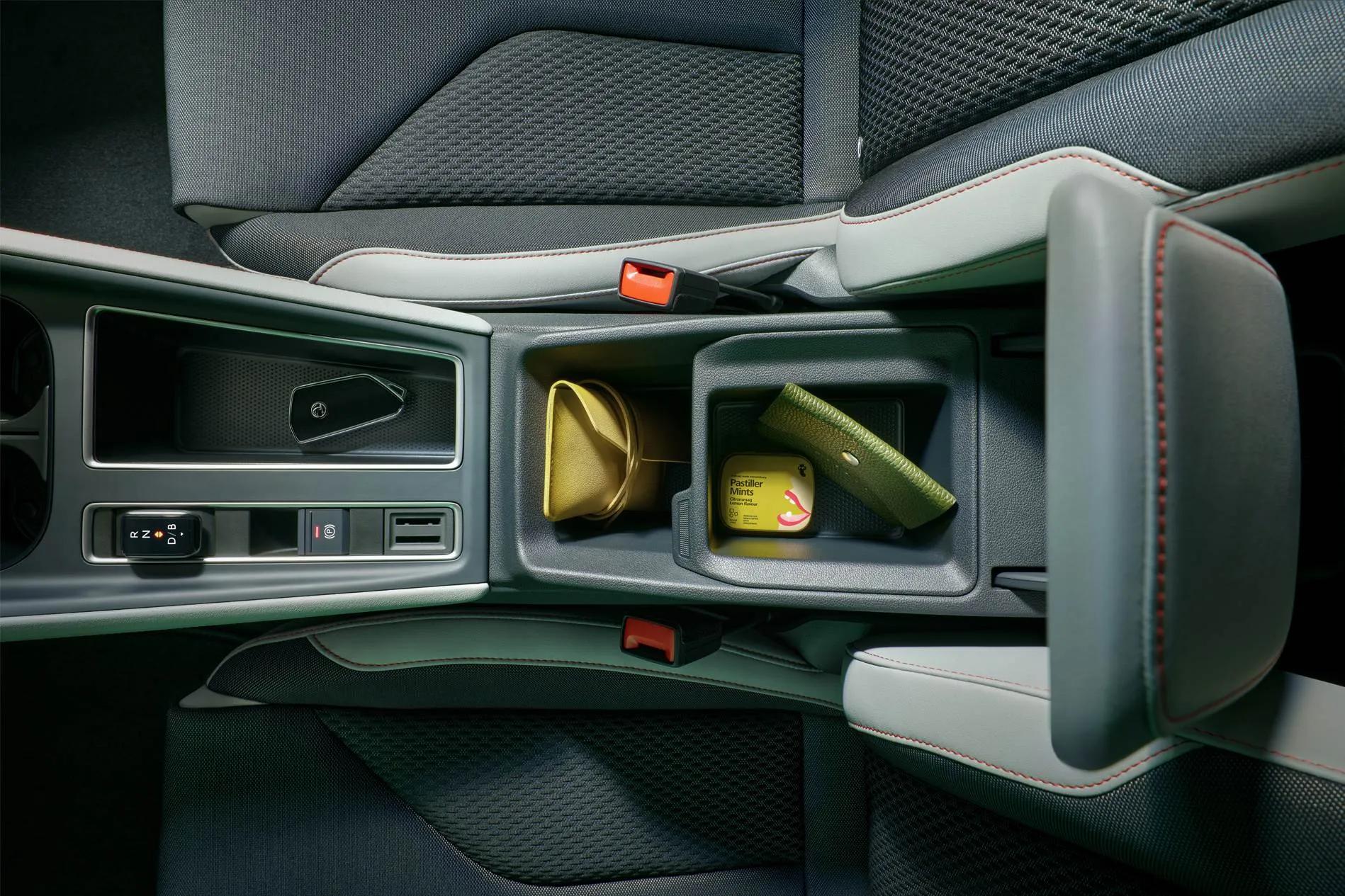 Voorin heb je lekker veel bergruimte voor kleine spulletjes. Je vindt er draadloos opladen-met-koeling voor een telefoon en twee keer USB. Er zijn diverse ambiances waaruit je kunt kiezen. Kies je bijvoorbeeld voor de Loft dan heb je mooie zachte stof bovenop het dashboard. En kies je voor de Lodge dan krijg je – jawel – oranje gordels.