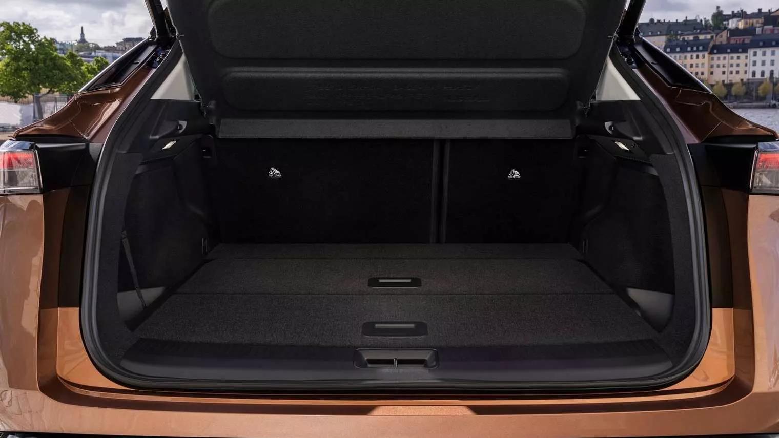 De Nissan is een flinke personenwagen: met een lengte van 4,59 meter valt de Ariya qua maatvoering tussen een Qashqai en X-Trail in. De kofferbak heeft een inhoud van minimaal 468 liter. Hoe dat zit wanneer je de rugleuning neerklapt, is onbekend: de Japanners doen daar geen uitlatingen over.