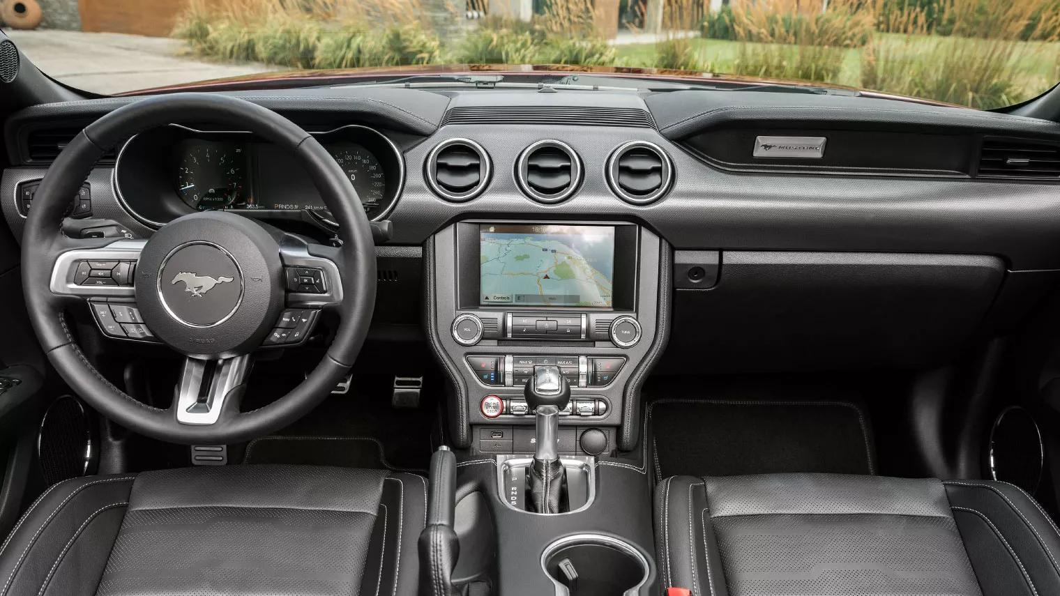 Als je voor het eerst plaatsneemt in deze Mustang, vraagt dat best enige gewenning. Zoals bij veel sportwagens met de motor voorin, zit je relatief ver naar achteren, vlak voor de achterwielen. Vanuit deze positie lijkt de voorkant van de Mustang echt gigantisch, wat ook de indruk geeft dat het een heel grote auto is, terwijl dat best meevalt. Formeel is dit een 2+2 en zoals meestal bij auto’s met die aanduiding is de achterbank vooral symbolisch; praktisch bruikbaar is die niet, zelfs kleine kinderen zitten hier vooral qua beenruimte krap. We reden proef met een Convertible. Het elektrisch wegklapbare cabrioletdak maakt een bijzonder degelijke indruk. het werkt mede door z’n constructieve eenvoud snel en probleemloos en het geeft de indruk dat tot in lengte van jaren zo te blijven doen. De bagageruimte meet ruim 400 liter en dat is best royaal, zekert omdat je de auto in de praktijk gebruikt als tweezitter. De bereikbaarheid van de bagageruimte is door het vrij kleine kofferdeksel minder handig.