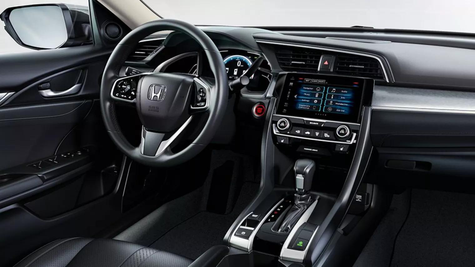 Het uiterlijk van de Civic vraagt wat gewenning en hetzelfde geldt voor de vormgeving van het interieur. Daar moeten we even ‘doorheen prikken’, de indeling van het dashboard en zo went vanzelf, als het de enige auto is waarin men rijdt. Dat geldt iets minder voor het uitzicht naar achteren, dat door de vorm van de achterkant altijd in tweeën wordt gedeeld. De ontdekkingstocht door het interieur kent meer verrassingen. Om te beginnen is de Civic heel ruim, niet in de laatste plaats achterin. Voorin staat een paar erg fijne stoelen, met volop verstelmogelijkheden. De bagageruimte meet in de hatchback al 420 liter, in de sedan zelfs 520 liter. Dat is ècht heel royaal. Leuke details komen we ook tegen. Zo blijkt de bekerhouder tussen de voorstoelen in een handomdraai te veranderen in een flessenhouder, groot genoeg voor een literfles water, bijvoorbeeld. Ook opvallend: de rolhoes boven de bagageruimte (HB) is zijdelings op te rollen en dan eventueel als een handvat uit te nemen. Dat is véél handiger dan in al die andere auto’s, waarbij je je afvraagt… waar láát ik dat ding?