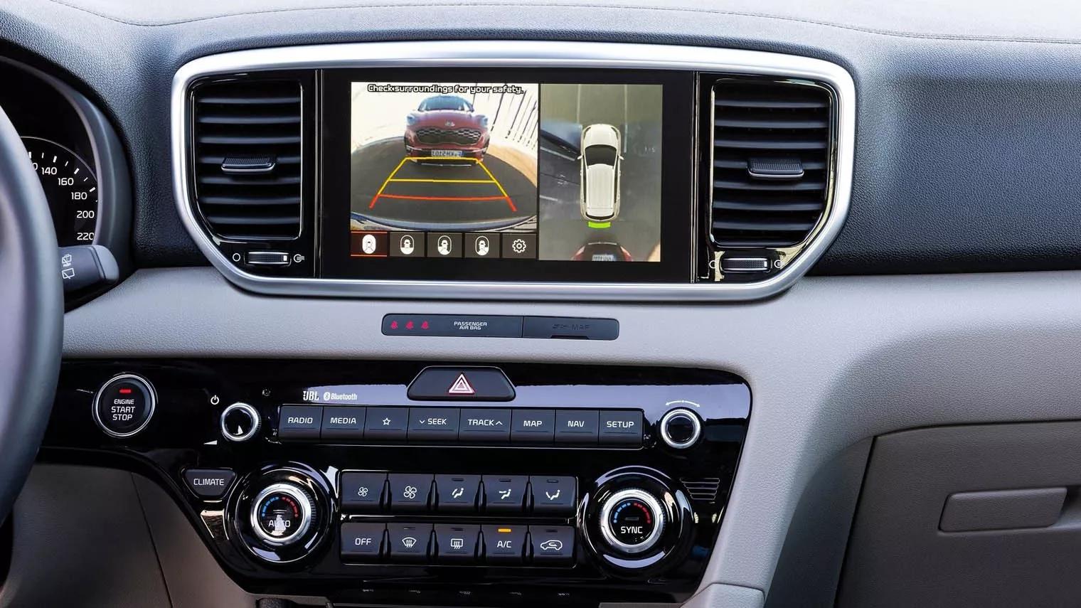 Deze Sportage is ongeveer van hetzelfde formaat als zijn voorganger. Dat is geen bezwaar, want het interieur is groot genoeg voor vier uit de kluiten gewassen volwassenen en leent zich ook voor lange ritten met z’n vieren. Het dashboard is wat ‘druk’ met al z’n knoppen en schakelaars, maar de bediening stelt nergens voor vraagtekens.