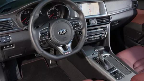Kia probeert de Optima SW wat sportiever neer te zetten met GT en GT-Line versies. De Optima SW 2.0 T-GDi, waar we vanwege de nieuwe motor de meeste kilometers mee reden, is zelfs alleen als GT te krijgen. Dat houdt onder meer in dat de auto een elektronisch instelbaar onderstel heeft (de stugheid van de schokdempers kan worden aangepast), rode remklauwen en een in de geluidsstudio ontworpen uitlaatgeluid. Bij dat laatste wordt er extra motorgeronk via de luidsprekers weergegeven. De rijkwaliteiten van de Optima SW zijn wel in orde, maar sportief kunnen we de auto niet vinden. Het inschakelen van de sportstand met een knopje achter de versnellingspook helpt daar ook niet bij. Het comfort wordt er minder door, de automaat gaat hardhandiger schakelen en de motor reageert sneller, maar niet nauwkeuriger op het gaspedaal. En je krijgt in die sportstand altijd extra gebrom van de motor via de luidsprekers; een onnatuurlijk geluid dat we al snel als hinderlijk gingen ervaren. We vonden de stationwagen eigenlijk het prettigst rijden in de spaarstand, want dan schakelt de automaat vroeg op, wat gezien het reeds bij 1.350 toeren aanwezige maximum koppel van 353 Nm makkelijk kan. En de eco-stand heeft als voordeel dat het motorgeluid gering blijft, de sound actuator niet meebromt en de auto als geheel beter in balans is. De besturing blijft echter in alle standen gevoelloos en als de rijstrookassistentie is ingeschakeld, stuurt de auto soms ongewild en onnodig een beetje voor jou, waardoor het contact met de wielen nog slechter aanvoelt. De Optima SW 2.0 T-GDi is wel een lekker vlotte auto, die moeiteloos hoge snelheden haalt (top 235 km/h) en ijverig sprint (0-100 in 7,6 sec). De Optima wordt standaard geleverd met rijstrookassistentie. In stapjes kan de uitrusting verder worden opgewaardeerd, maar de 2.0 T-GDi is altijd een GT met het 'hele boekje' aan luxe. In dat geval is er ook een hele reeks veiligheidsvoorzieningen en assistentiesystemen aan boord, zoals autonoom remmen in de stad (Autonomous Emergency Braking), adaptieve snelheidsregeling, een parkeerassistent, een camera die de verkeersborden leest, dode hoek-detectie, een alarmering voor kruisend verkeer achter de auto (Rear Cross Traffic Alert), een grootlicht-assistent en bochtverlichting.De Kia Optima Sportswagon GT 2.0 T-GDi van binnen