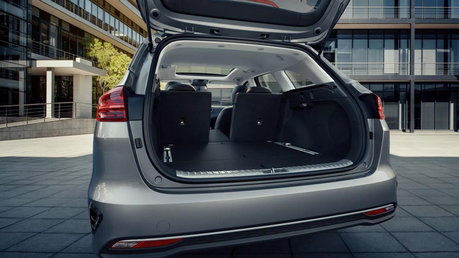 Onze aandacht gaat natuurlijk vooral uit naar het bagageruim. Dit is per slot van rekening een stationwagon. De bagageruimte meet 625 liter met de achterbank op zijn plek, en 1.694 liter met de bank plat. Om je een betere indruk te geven, daarmee is hij ruimer dan de Ford Focus stationwagon (490 – 1.516 liter) maar ook ruimer dan een VW Golf Variant (605 – 1.620 liter). Niet verkeerd dus. Een lage tildrempel en een dubbele bodem maken de achterbak ook goed bruikbaar. De achterbak in neer te klappen in de verhouding 40:20:40. Leuk foefje: met de keyless entry sleutel op zak gaat de achterklep vanzelf open, zodra je achter de auto blijft stilstaan. Jehoort eerst piepjes als waarschuwing. Mocht het dus niet je bedoeling zijn dat de klep opent (omdat je gewoon achter de auto met de buurman staat te praten) dan moet je even een stap opzij doen. Voordeel volgens Kia is dat je niet met je voet onder de achterzijde hoeft te zwaaienom de klep te openen, zoals bij andere merken het geval is.