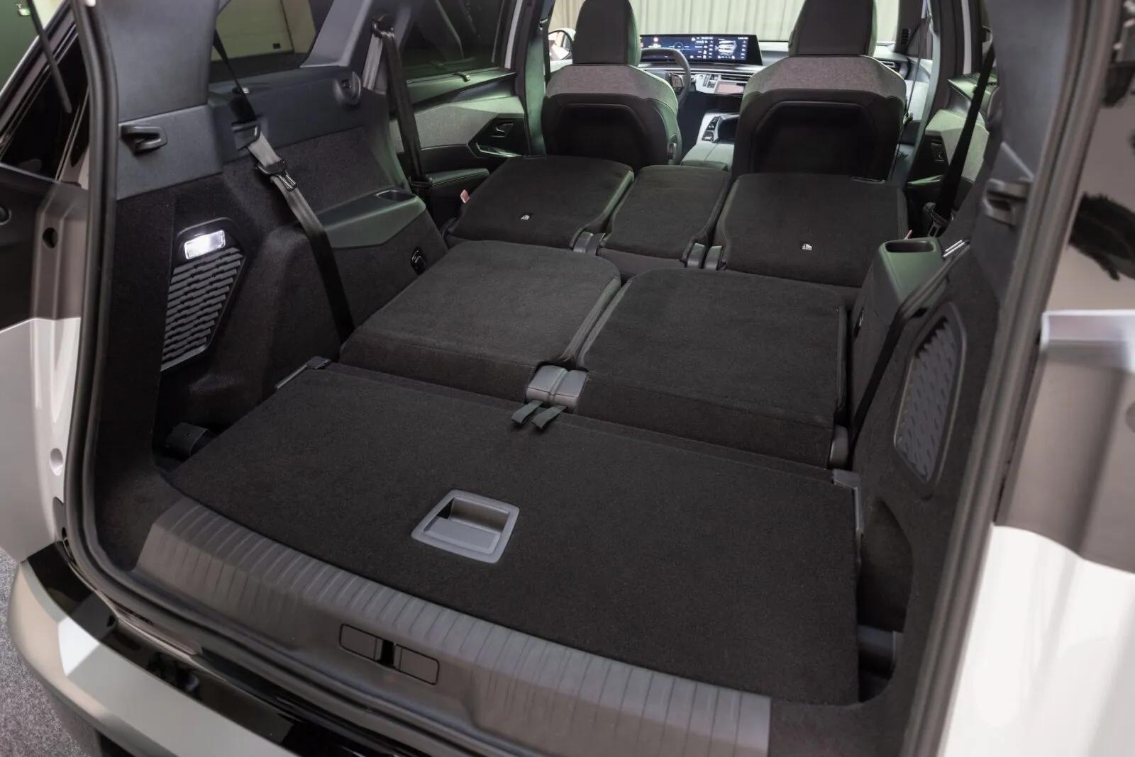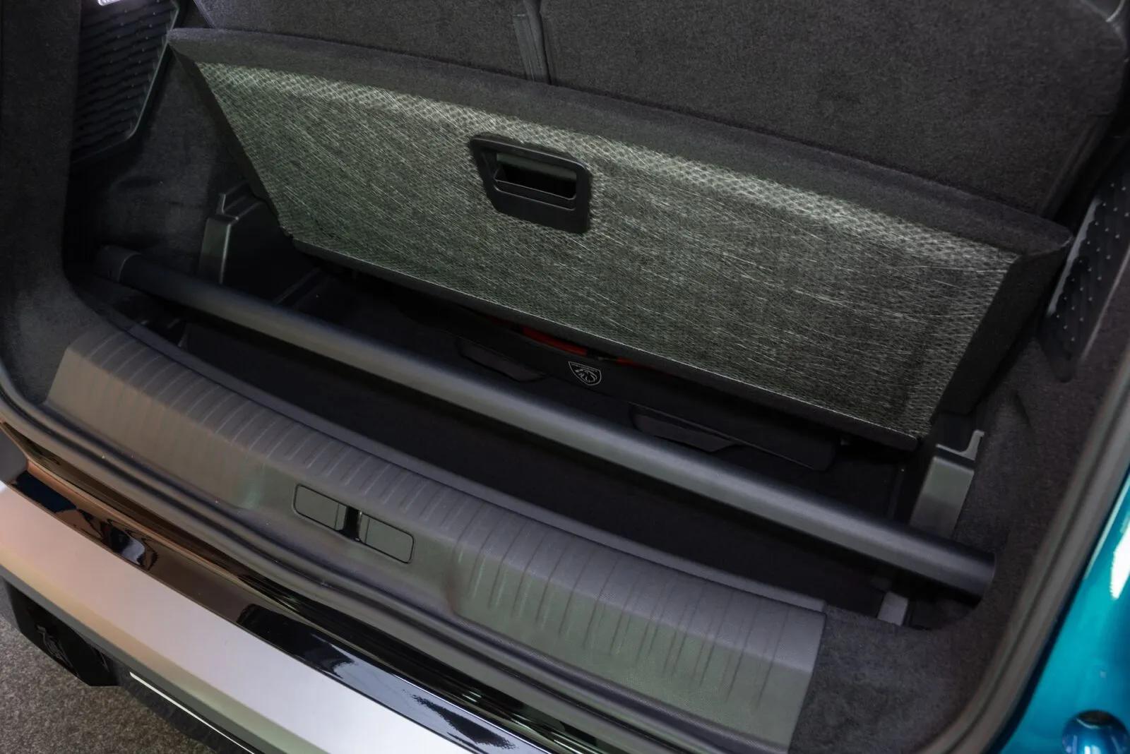 Achter de derde zitrij zit in de vloer een dubbele bodem waar je eenvoudig de rolhoes en de laadkabel kunt opbergen. De auto heeft trouwens geen frunk (laadruimte in de neus) omdat de 5008 er ook is met een benzine-gestookte aandrijflijn.