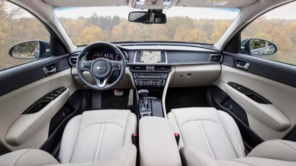 Op het moment van schrijven verkoopt Kia Nederland de Optima alleen met een 141 pk sterke dieselmotor. Dat blok, 1,7 liter groot, is een stuk sterker dan de eenvoudigste zelfontbranders van Ford en Volkswagen. Ook het koppel ligt met 340 Nm hoger, net als het trekgewicht. Dat bedraagt bij de Koreaan 1.800 kilogram. De daklijn van de Kia is echter dusdanig laag, dat uw testredacteur met zijn lengte van 1.93 meter maar moeilijk van die prestaties kon genieten. Een week lang zat hij verkrampt achter het stuur, met dank aan het glazen dak waarmee de wagen vanaf het tweede uitrustingsniveau is uitgerust. Een bijzondere extra voor een sedan, maar geen aanrader voor lange lieden. Ben je niet zo groot, dan beleef je meer plezier aan de Optima. Het is een comfortabele auto, die zeker in combinatie met de door ons gereden zeventraps automaat nauwelijks steken laat vallen. Je hebt altijd genoeg vermogen voor handen en daar hoef je niet eens de aanwezige sportstand voor in te schakelen. Onderweg hoor je de dieselmotor nauwelijks, maar dat kan niet worden gezegd van de banden. Afrolgeluiden dringen namelijk wél tot de inzittenden door. Wat dat betreft zijn er stillere alternatieven voor handen, zoals ook de besturing niet tot de beste in het segment behoort. De stuurinrichting van de grote Kia doet wat hij moet doen, maar gevoel komt er niet bij kijken. De Optima is leverbaar met een uitgebreide veiligheidsuitrusting, al zijn de meeste systemen voorbehouden aan het duurste uitrustingsniveau. Optioneel bijbestellen behoort niet tot de mogelijkheden. Selecteer je in de folder de door ons gereden ExecutiveLine met automaat, dan heb je de beschikking over dodehoekdetectie, verkeersbordherkenning, adaptieve cruise control, een waarschuwing bij kruisend verkeer en een actieve rijstrookassistent. Ze mogen de veiligheid dan ten goede komen, de Kia gaat er niet aangenamer door rijden. De hulpsystemen doen namelijk overdreven hun best. Zo worstel je met de rijstrookassistent om het stuurwiel, versnelt én vertraagt de adaptieve cruise control nogal abrupt en geeft de dode hoek signalering een indringende piep wanneer je zelf aan het inhalen bent. Sinds de modelwissel beschikt de Optima over een extra zijruitje, maar dat draagt er niet aan bij dat je meer ziet over je rechterschouder. Het zicht rondom blijft dus een aandachtspunt.De Kia Optima 1.7 CRDi van binnen