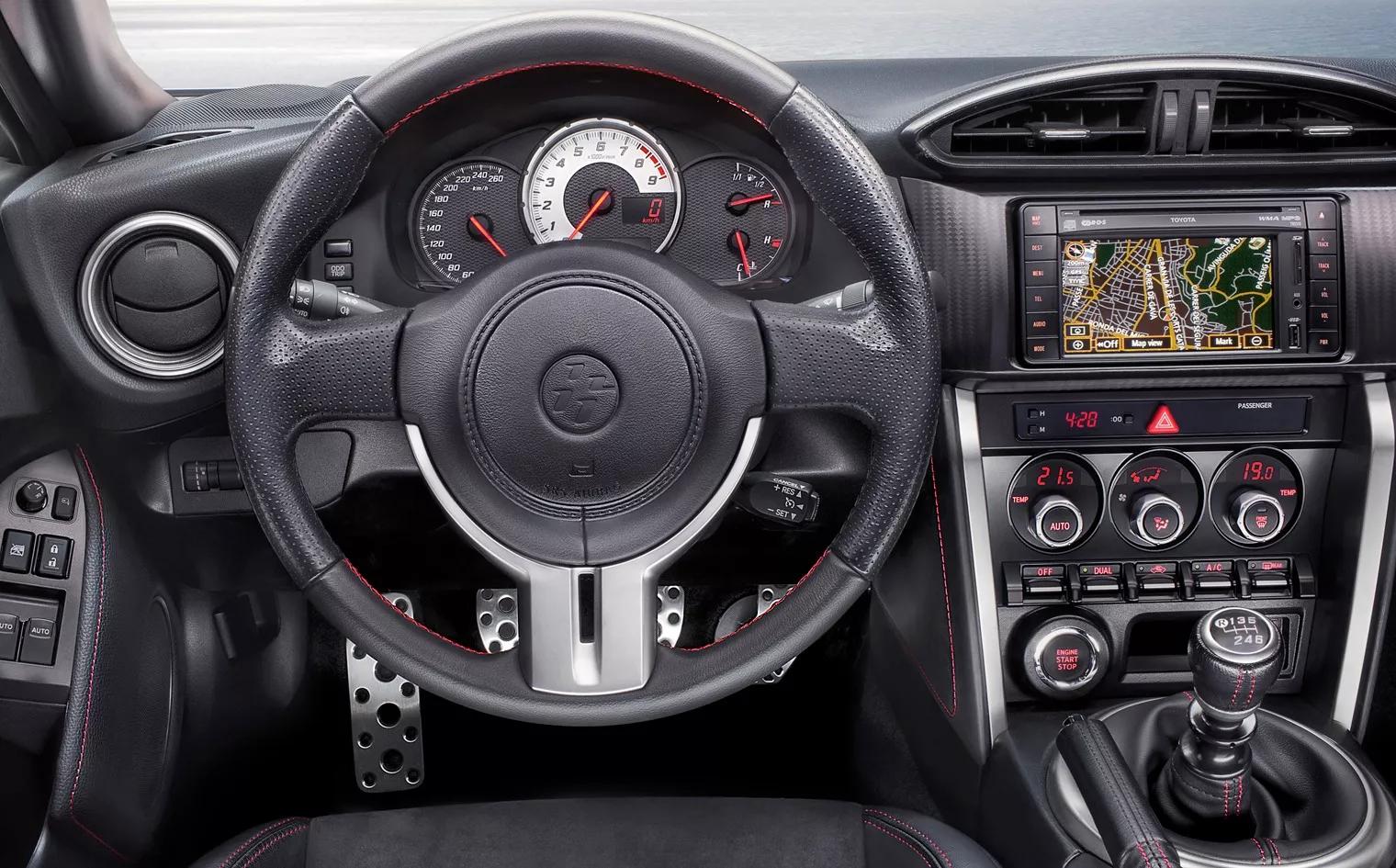 De GT 86 / BRZ is een pure, echte sportcoupé. Motor in de lange neus voorin, korte achterkant. Wie dit wil, zal er geen moeite mee hebben om wat concessies te doen op enkele andere vlakken. De ruimte achterin is symbolisch en de matig bereikbare bagageruimte meet slechts 243 liter. Dat betekent slim pakken, voor de vakantiebagage. Het uiterlijk is natuurlijk heel sterk een smaakkwestie. We kunnen alleen stellen dat Toyota en Subaru tamelijk compromisloos zo’n tweezitter hebben getekend, mede daardoor zijn er bij de facelift alleen onbelangrijke details gewijzigd. Het pure is gelukkig gebleven. Eenmaal achter het stuur blijft het karakter van de auto intact. Er staan twee erg goede kuipstoelen voorin, met gelukkig ook in lengte aanpasbare zittingen. Personen met een heel breed postuur zullen hier minder fijn in zitten, maar pas je erin, dan sluit het aan als een duikerspak. Het dashboard is vrij eenvoudig, gedeeltelijk digitaal, maar wel heel goed afleesbaar. Dat telt. Het multi-mediascherm is (gelukkig!) vrij compact, maar spiegelt wel een beetje. Verder is het uitzicht vooral over de rechterschouder vrij beperkt.