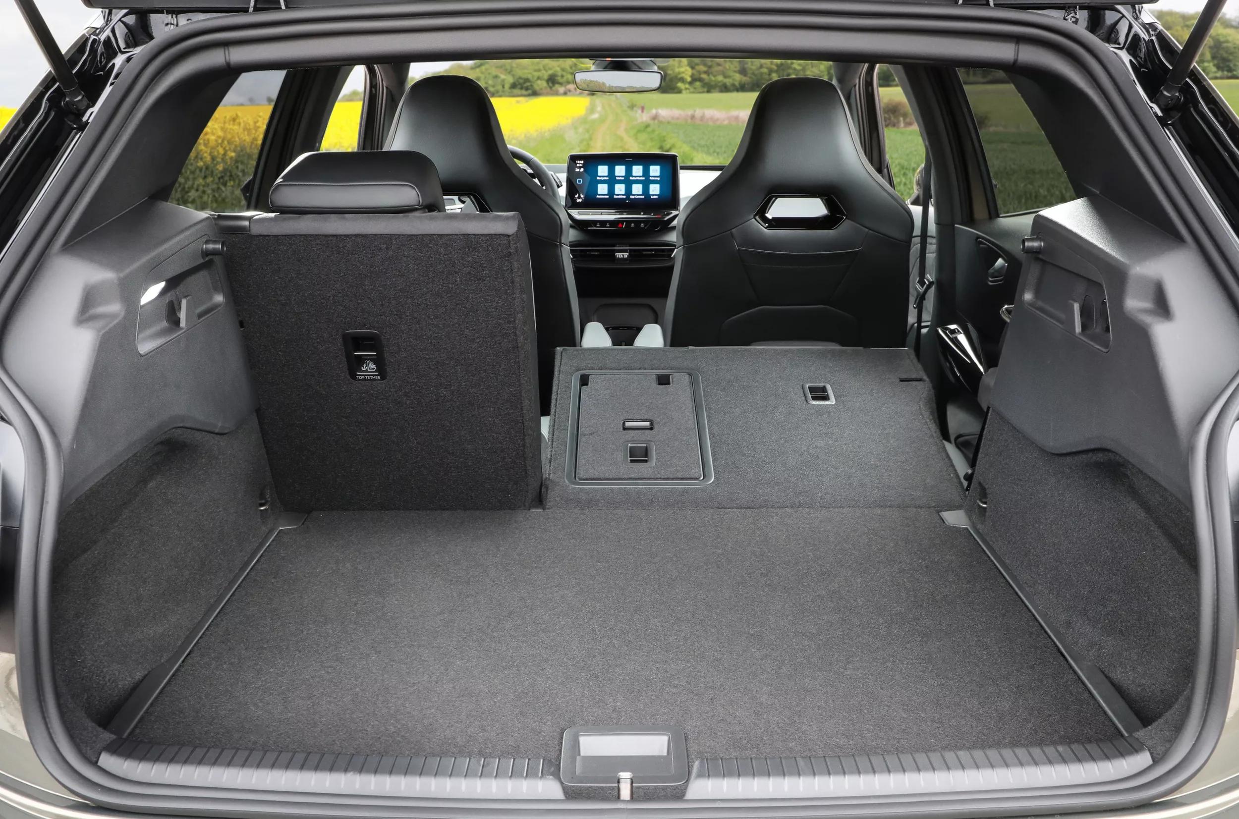 Ondanks de doorgevoerde interieurwijzigingen zijn de achterdeurpanelen nog altijd van knalhard plastic. Een variabele laadbodem staat onverminderd op de optielijst, maar twee stroompunten voor de achterpassagiers zitten tegenwoordig bij de prijs inbegrepen. Zitten doe je achterin als een vorst, want de wielbasis van de ID.3 houdt het midden tussen die van de huidige Golf en Passat. Wanneer je het optionele panoramadak laat voor wat het is, hebben lange inzittenden op de achterbank evenveel hoofd- als beenruimte.