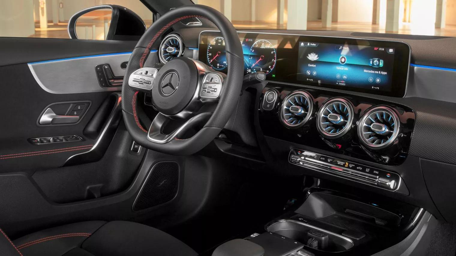 Nu de CLA hoger wordt gepositioneerd, dient de A-Klasse Limousine feitelijk als vervanger. Van een traditionele sedan zou je verwachten dat –ie meer binnenruimte biedt dan een vierdeurs coupé, maar dat valt mee (of eigenlijk tegen). De kofferbak van de Limousine is 420 liter groot; 50 liter kleiner dan die van de oorspronkelijke CLA. De sedan beschikt wel over een dubbele bagagebodem, zodat er een vlakke, zij het oplopende laadvloer ontstaat. De daklijn ligt weliswaar hoger dan bij de vierdeurs coupé, maar veel scheelt dat niet: het gaat maar op een paar centimeter. Op de achterbank kunnen lange volwassenen niet rechtop zitten. Zij kunnen wel hun benen kwijt, omdat Mercedes de rugleuning van de voorstoel van een uitsparing heeft voorzien. Een fikse middentunnel maakt, dat er geen drie personen naast elkaar passen. De A-Klasse voorziet wel in eigen uitstroomopeningen en twee stroompunten voor de passagiers achterin. Die stroompunten zijn echter van het type USB-C: een aansluiting waarvoor lang nog niet iedere Nederlander een oplaadkabel bij zich draagt. De inzittenden voorin kijken uit op een imposant – en optioneel - instrumentarium, dat uit twee flinke schermen bestaat. De Mercedes denkt bovendien met je mee, omdat de auto is voorzien van kunstmatige intelligentie. Of je daar daadwerkelijk mee geholpen bent, is een tweede: de ‘stem uit het dashboard’ klonk op momenten dat we er niet om vroegen en wist het antwoord niet wanneer we wél ergens naar informeerden (het weer of de verkeersinformatie bijvoorbeeld).