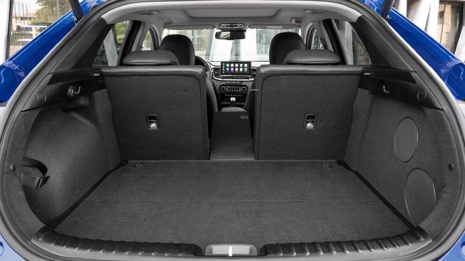 De inhoud van de laadruimte van de XCeed is afhankelijk van de gekozen motorisering: de door ons gereden versie heeft geen bergruimte onder de bagagevloer, omdat het voor de elektromotor benodigde batterijpakket op die plek is ondergebracht. Een stevige aderlating, aangezien de grotere kofferbak juist een van de redenen is om de XCeed boven een reguliere Ceed te verkiezen! De kofferbak van de standaard Ceed is minimaal 395- en maximaal 1.291 liter groot. De XCeed weet in principe raad met 426- tot 1.394 liter aan spullen, tenzij je dus kiest voor een uitvoering met een elektrische hulpmotor. Dan blijft daarvan nog 380 liter over met de achterbank overeind en 1.332 stuks met het meubilair weggeklapt. Het uitrustingsniveau van onze testauto is ‘t enige met een in drie delen neerklapbare achterbank: in alle overige gevallen gaat de bank netjes door de helft. Zijn kleine raampjes maken de Kia hoe dan ook donker van binnen. Dat kun je goed merken wanneer je achterin plaatsneemt! Dankzij de gekantelde zitting hebben ook lange volwassenen hier voldoende hoofdruimte. De beenruimte houdt echter niet over. De rugleuning van de voorstoel is ook nog eens bekleed met hard kunststof, dus als je al krap zit, houd je daar geheid zere knieën aan over. De XCeed heeft geen middentunnel van betekenis. De achterpassagiers hebben hun eigen ventilatiemogelijkheid, maar moeten het zonder stroompunt stellen. De duurdere uitvoeringen zijn verkrijgbaar met een elektrisch bediende achterklep, die opengaat wanneer je alleen al met de sleutel in de buurt komt. Handig wanneer je jouw handen vol hebt! Achter het stuur van onze testuitvoering stuiten we op wel meer snuisterijen. Van stoelventilatie tot het draadloos opladen van je smartphone: het is op deze Kia allemaal leverbaar. Ook een digitaal instrumentarium behoort tot de mogelijkheden, al ontgaat ons het nut daarvan. Je kunt in de XCeed bijvoorbeeld niet de kaart van het navigatiesysteem tussen je meters tevoorschijn te toveren, waardoor je in feite een joekel van een boordcomputer overhoudt. En om daar nu extra geld voor te betalen..?