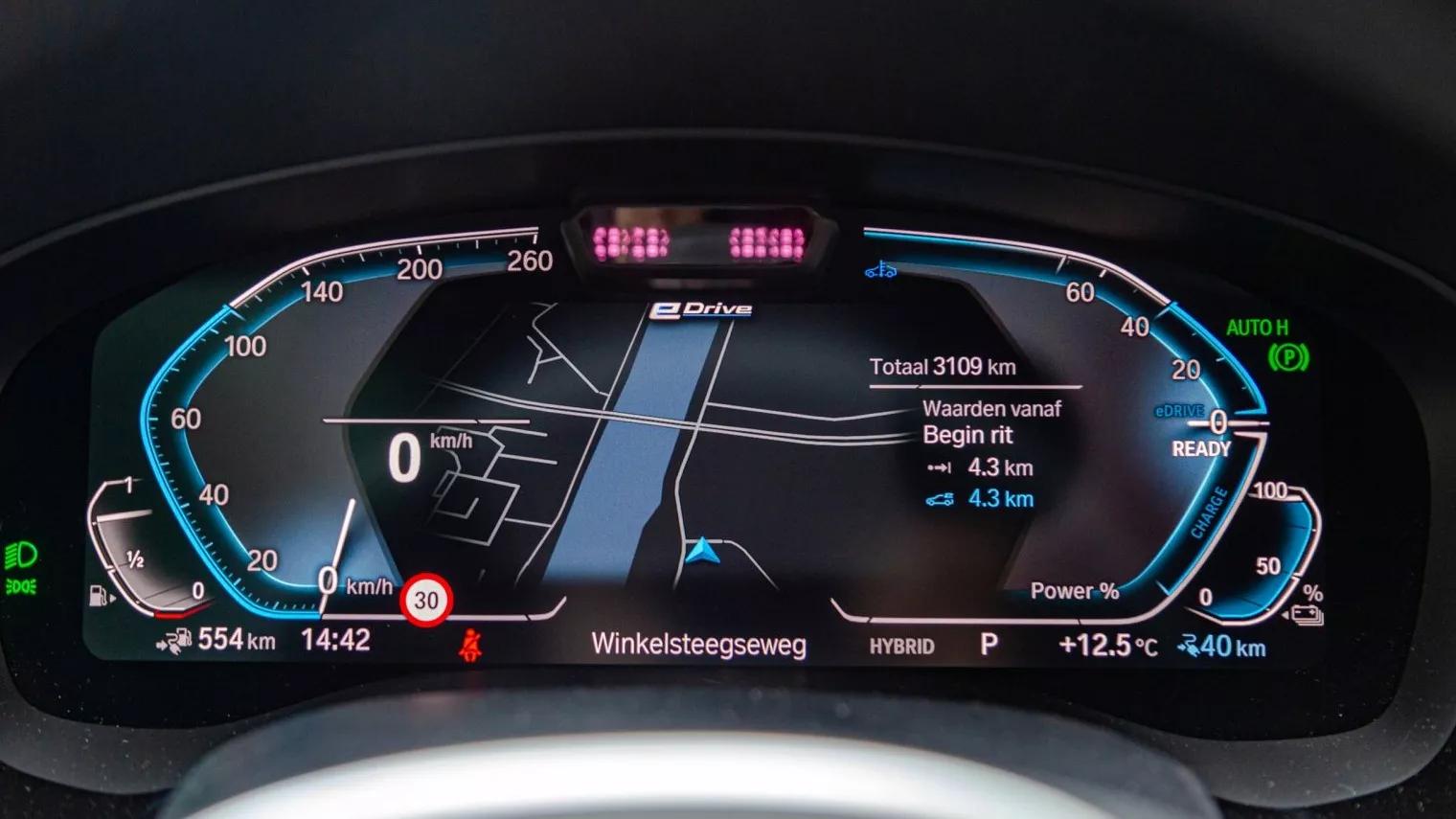 De BMW 530e kan zo’n 50 kilometer louter op stroom rijden – waarmee hij in de pas loopt met veel andere plug in hybrides. Uit onderzoeken is gebleken dat de gemiddelde woon-werkafstand in Nederland lager is dan die 50kilometer. Ergo: mits je telkens ‘stekkert’ zodra het kan, zou je die afstand dus moeten kunnen afleggen zonder een druppel benzine te verbruiken waardoor je dus een zeer laag brandstofverbruik realiseert. BMW claimt zelfs een optimistisch fabrieksverbruik van 1 op 58,8. Das leuk becijferd en zal op papier ongetwijfeld kloppen, maar in de praktijk haalt natuurlijk niemand dat. Tijdens onze vaste brandstofmeting kwamen we tot een gemiddeld benzineverbruik van 1 op 15,7. Dat is realistisch en voor een bijna 1.900 kilogramzware auto in deze klasse keurig. Het 12 kWh grote batterijpakket is in 3,5 uur van leeg weer helemaal vol. Is de accu tijdens het rijden bijna leeg? Dan gaat auto stroom terugwinnen tijdens het uitrollen of remmen, die vervolgens weer wordt ingezet bij accelereren. Als je wilt dat hij nog verder oplaadt dan druk je op de batterijknop tussen de voorstoelen. Handig als je bijvoorbeeld een uitstootvrije zone tegemoet rijdt.