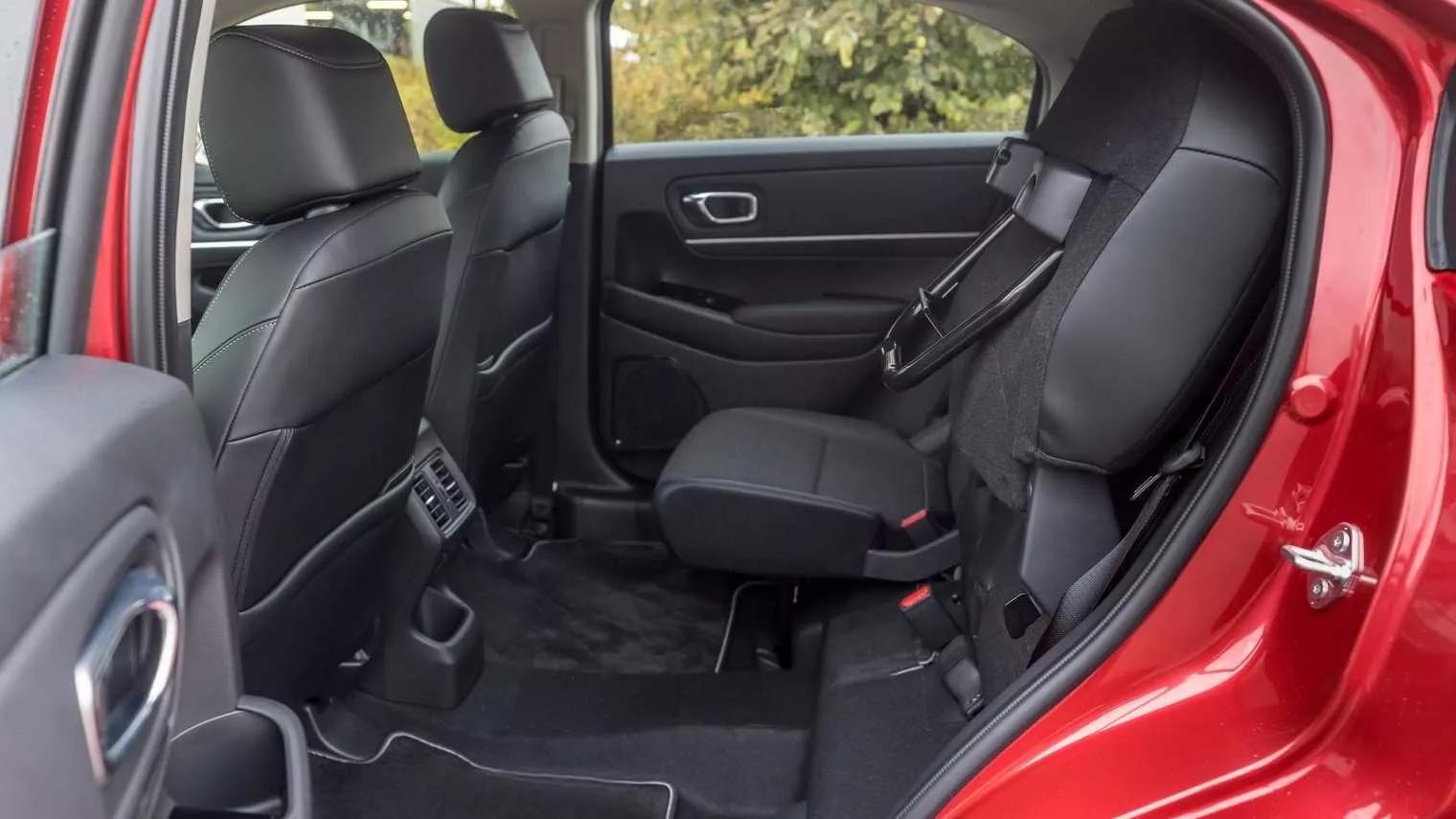 De bagageruimte van de HR-V is minimaal 335- en maximaal 1.305 liter groot. Dat is in vergelijking met menig alternatief een bescheiden kofferbakinhoud, maar waar je bij de concurrentie alleen de rugleuning plat kunt leggen, kun je bij de Honda ook de zitting van de achterbank opklappen. Dat noemen de Japanners ‘magic seats’ en daar zit wat in, want op deze manier kun je in de voetenruimte allerlei spullen met een onhandig formaat kwijt. Een kamerplant bijvoorbeeld, of een fiets. Is al sinds jaar en dag een unieke eigenschap voor Honda en je hoeft er geen cent voor bij te betalen. Gebruik je de achterbank van de HR-V om op te zitten, dan valt op hoeveel beenruimte je tot jouw beschikking hebt. Het formaat van de middentunnel is verwaarloosbaar, zodat je eventueel nog een derde passagier kwijt kunt. De inzittenden achterin hebben in onze testuitvoering de beschikking over hun eigen ventilatieroosters en stroompunten. De hoofdruimte houdt voor volwassenen niet over. Daar staat tegenover dat je eenvoudig in- en uitstapt, omdat de achterportieren vrijwel haaks op de koets openen.