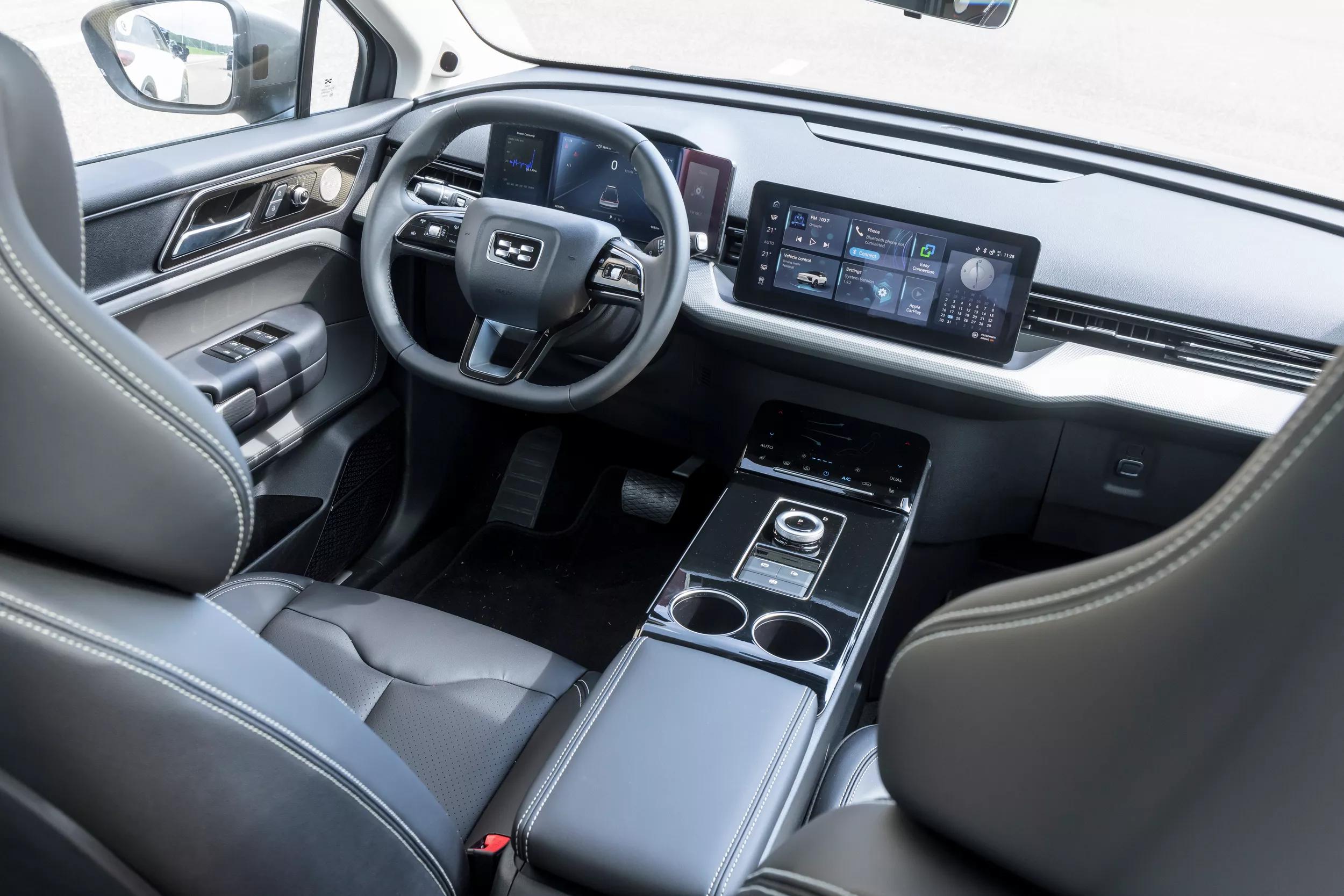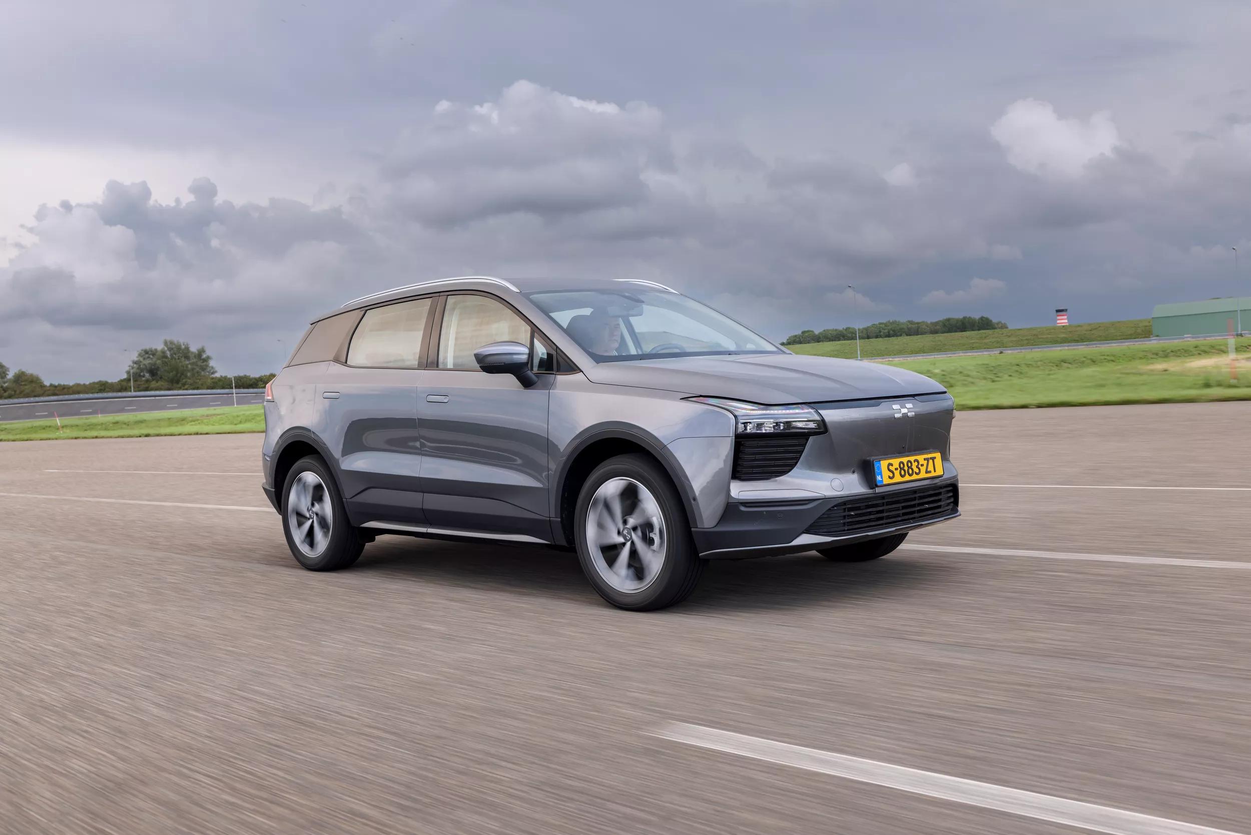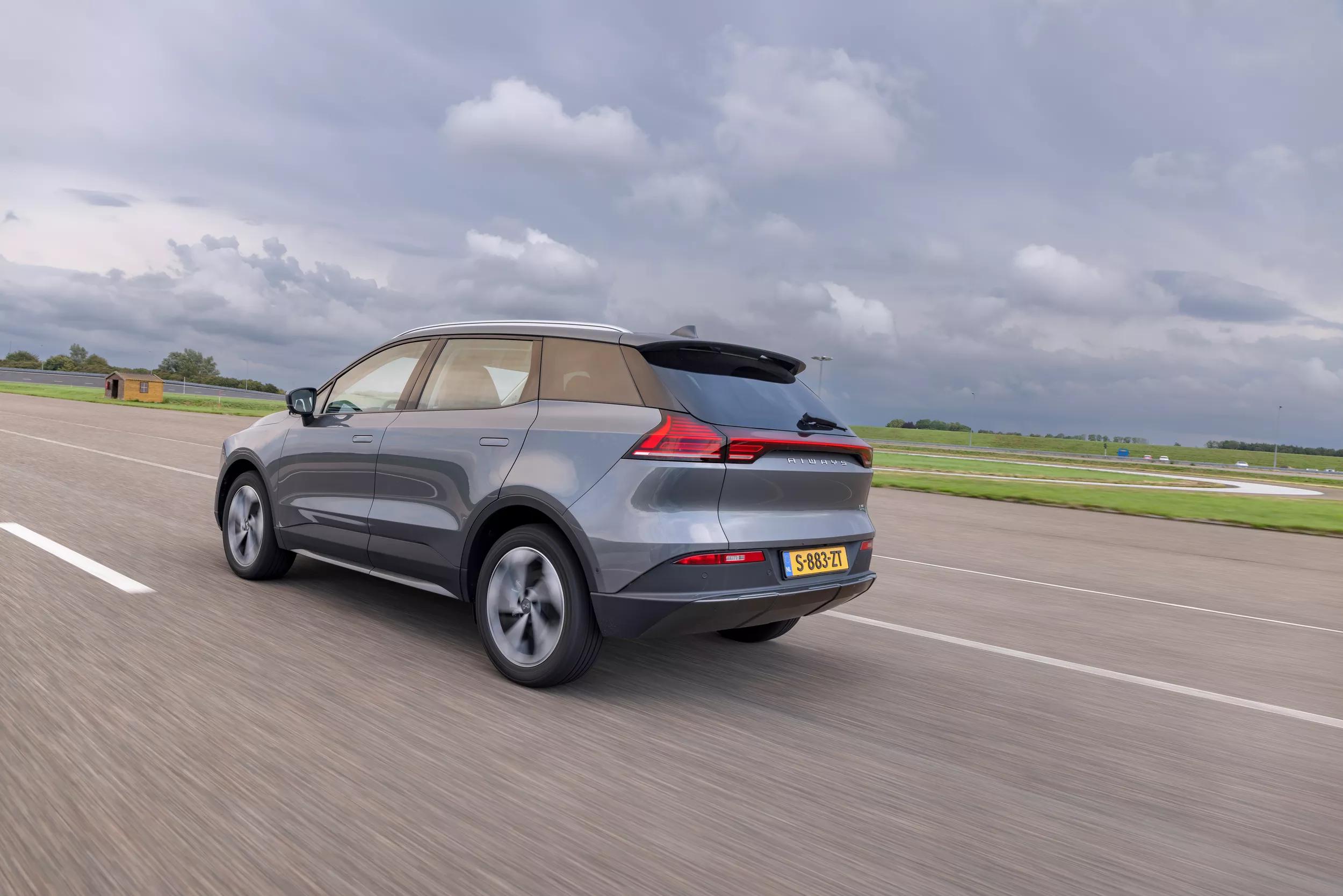 De U5 weegt ‘slechts’ 1.770 kilogram, maar toch is hij niet zo rap als je zou verwachten. Dat heeft te maken met de manier waarop de vermogensafgifte plaatsvindt: bij het wegrijden houdt de crossover iets in, bijna alsof hij je al die Newton meters niet toevertrouwt. Eenmaal op gang verdwijnt die terughoudendheid. De aandrijflijn van de Aiways is goed voor 204 pk en 310 Nm koppel, met een voor ’n EV stevig trekgewicht van 1.500 kilogram. Het onderstel ‘kopieert’ het wegdek: dat maakt de rijbeleving wat onrustig. De zit is aangenaam hoog, maar de geprononceerde hoofdsteunen dwingen je armen naar voren. Op lange ritten werkt dat vermoeiend. Daar komen het zeurende geluid van de elektromotor en de rijwind rond de buitenspiegels dan nog bij.