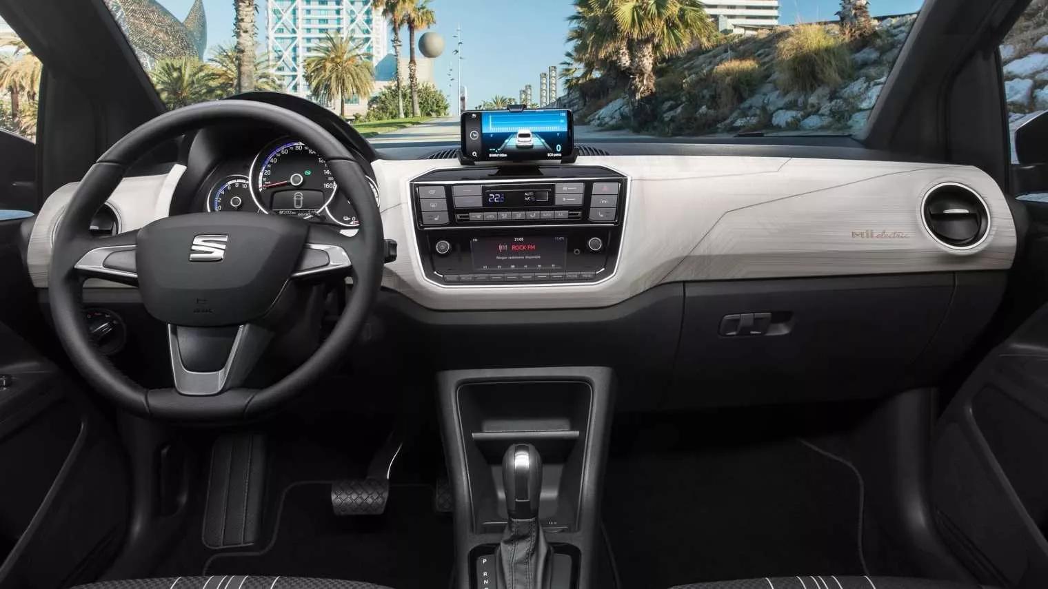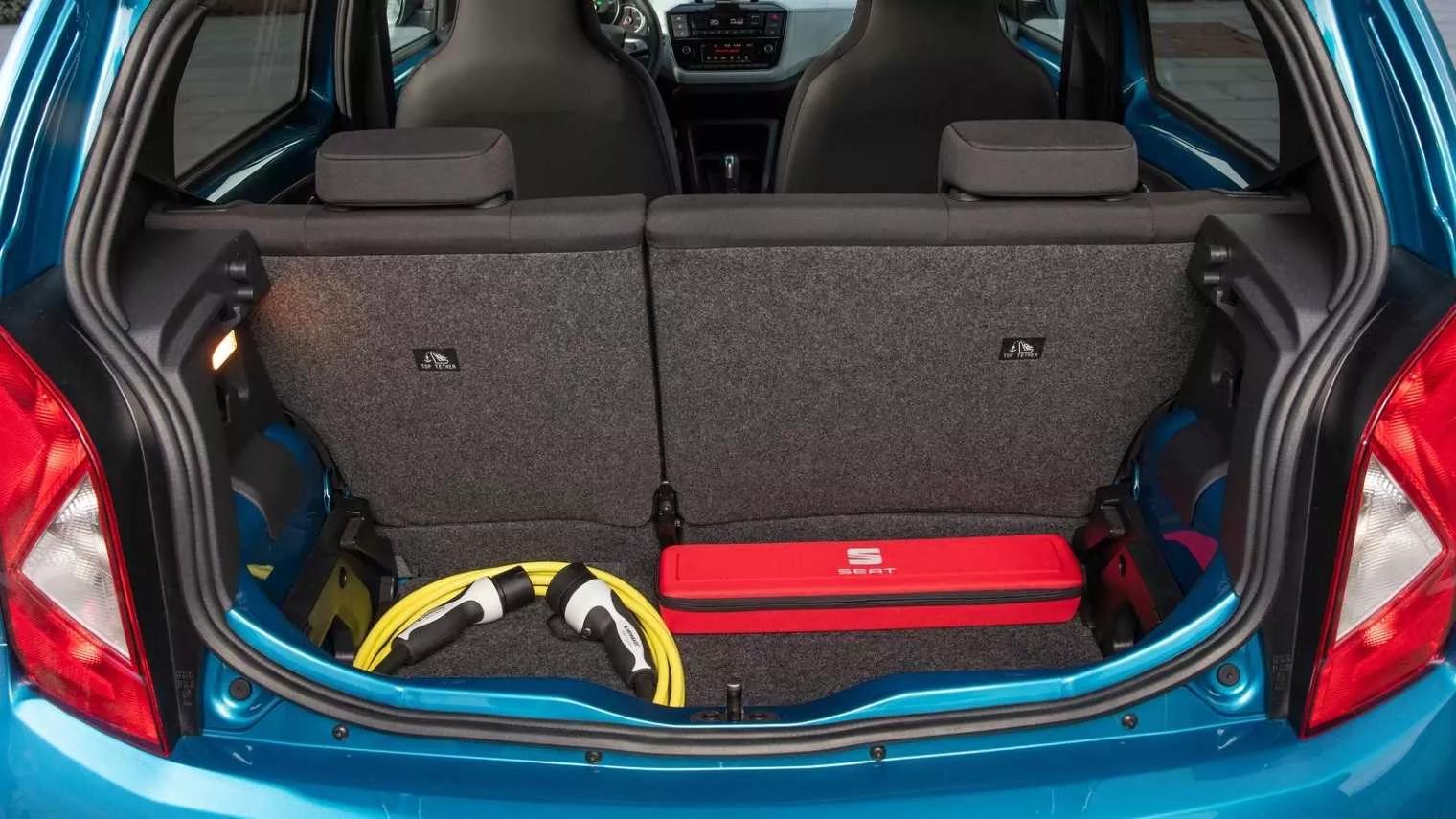 In vergelijking met sommige van zijn concurrenten heeft de Mii een spartaans interieur. Weliswaar kun je de stadsmini uitrusten met zaken als cruise control en stoelverwarming, maar je zoekt aan boord vergeefs naar een infotainmentsysteem. Daarvoor ben je aangewezen op je eigen smartphone, die je in een houder op het dashboard klikt. Ondanks de hogere aanschafprijs toont ook de elektrische uitvoering van de Mii het nodige plaatstaal in het interieur. Verder kunnen de achterramen niet fatsoenlijk open: je kunt ze hooguit op een kiertje zetten. Op de achterbank is de hoofdruimte riant voor een auto van dit formaat. Wie langer is dan gemiddeld, zit wel met de rugleuning van de voorstoel tussen zijn knieën. De achterpassagiers moeten het zonder stroompunt of ventilatievoorziening stellen. Ze zitten bovenop het batterijpakket, zodat de bagageruimte gelijk is gebleven aan een exemplaar met een benzinemotor. Met minimaal 251- en maximaal 953 liter inhoud is de kofferbak van de Seat weliswaar niet de grootste in zijn klasse, maar de stadsauto hoeft zich ook nergens voor te schamen. De Mii electric is voorzien van een in hoogte verstelbare bagagebodem, waarmee je eenvoudig een vlakke laadvloer creëert. Je hoeft de bergruimte onder de vloer niet eens te gebruiken om je laadkabel op te bergen, want daarvoor hebben de Spanjaarden een speciale voorziening getroffen ter hoogte van de kentekenplaat. Hier vind je een vak waar je de kabel zo inschuift.