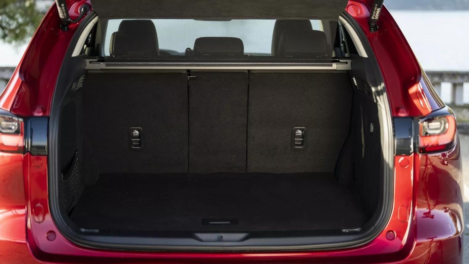 Vanwege de lange neus is de been- en hoofdruimte achterin voor volwassenen hooguit toereikend. Je kunt op de achterbank wel moeiteloos drie opgroeiende kinderen kwijt, vanwege een nagenoeg ontbrekende middentunnel. De kofferbak is flink. Met de achterbank op z’n plek heb je 570 liter laasdruimte, klap je alles weg dan kom je op 1.726 liter inhoud. Het interieur van de CX-60 telt daarnaast de nodige opbergmogelijkheden.