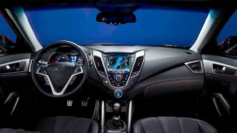 We rijden in de meest luxe i-Catcher uitvoering. En die krijg je voor € 29.995. Hij is dan wel voorzien van extra’s als een uitstekend werkend navigatiesysteem, cruise control, een achteruitrijcamera en een panoramisch, elektrisch bedienbaar schuifdak. Leuk hoor, dat panoramadak. Maar als je dat op de snelweg opent, word je getrakteerd op letterlijk oorverdovend lawaai. Bovendien neemt dit dak kostbare hoofdruimte weg. Over de rijeigenschappen kunnen we kort zijn: die zijn dik in orde. De wegligging is prima te noemen. Ook bij een snelle uitwijkmanoeuvre blijft hij bijzonder goed in zijn spoor. Hij stuurt verder redelijk direct en licht. Het onderstel is een compromis tussen sportief en comfortabel. Daar is goed mee te leven. Alleen op verkeersdrempels komt de achterkant nogal hard over. Verder doet de zesbak zijn werk perfect. De verzetten laten zich snel en gemakkelijk vinden. De Veloster ziet er sneller uit dan hij daadwerkelijk is. Anders gezegd, de prestaties vallen ons een beetje tegen. Van 0-100 km/h duurt volgens de fabriek 9,8 seconden. En de topsnelheid bedraagt 201 km/h. Op zich niet slecht maar van zo’n flitsende coupé verwacht je gewoon meer vermogen. Een tweeliter turbo zou deze Hyundai zeker niet misstaan. Zuinig is deze 1.6, die standaard is voorzien van een start-stopsysteem, weer wel. Wij rijden gemiddeld 1 op 14 met deze Veloster. En dat is voor een auto van dit formaat netjes.De Hyundai Veloster van binnen