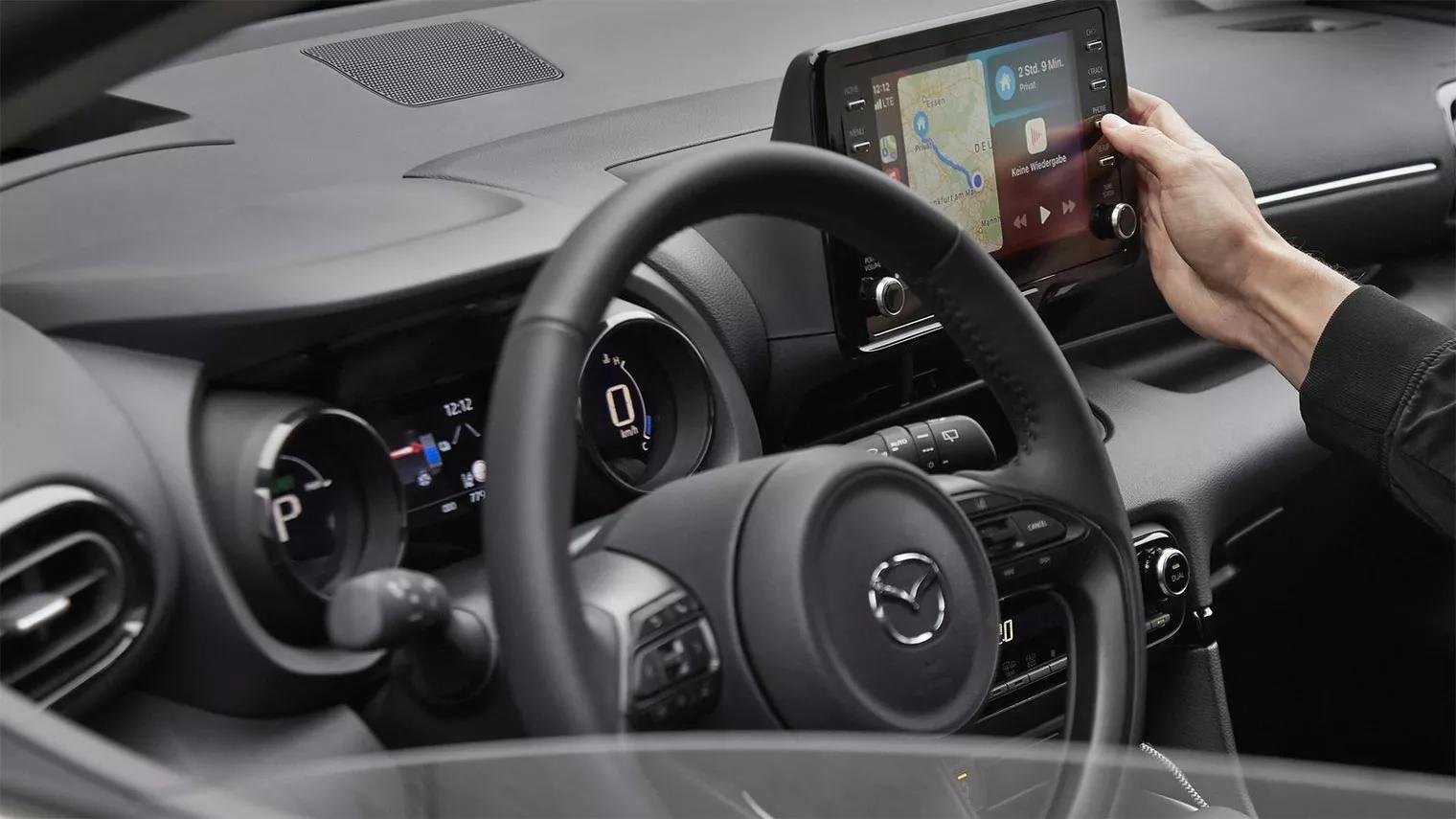 Het binnenste van Mazda’s eigen 2 is opgetrokken uit hoogwaardiger bekledingsmaterialen dan deze donor-Toyota. Daarin worden veel harde kunststoffen gebruikt. En er is nog iets dat opvalt: Mazda weigert tot nu toe aanraakschermen in hun auto’s te monteren, omdat ze dat niet veilig vinden. Maar dat principe weegt schijnbaar minder zwaar, wanneer ze een kant-en-klaar product van een andere fabrikant betrekken.