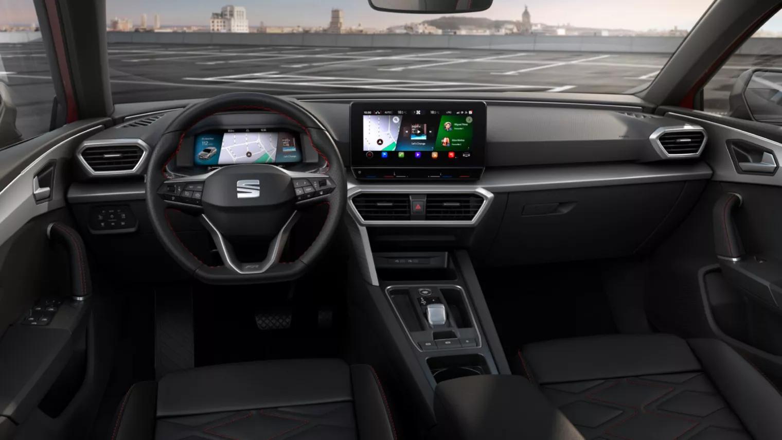 Veel van het interieur lijkt in meer of mindere mate op dat van andere VAG-producten zoals de VW Golf. Voordeel: het functioneert allemaal goed en is mooi afgewerkt. Nadeel: het is niet heel erg sexy. Enfin, wat je een gevoel van luxe geeft is de manier waarop het infotainment reageert als je met je vinger naar het aanraakscherm gaat. Nog voordat je het scherm daadwerkelijk aanraakt springt de functie al aan waarnaar je wijst. Door lichaamswarmte herkent het scherm je vinger. Helaas zijn de ingenieurs bij het scherm van de Seat Leon wat te ver doorgeschoten in het onderbrengen van diverse functies in menu’s. Zo is even snel de ramen ontwasemen er niet bij. Je zult door menu’s heen moeten. En dat terwijl een goeie ouwe drukknop toch écht effectiever is. Hetzelfde geldt voor het aanpassen van de temperatuur of het hoger/lager zetten van de blower. Door menuutjes dus nodeloos ingewikkeld. Verder heb je even nodig om te wennen aan enkele bedieningen, die net even anders werken dan je verwacht. Zo bedien je het volume van de radio door met je vinger over een display te schuiven – waarbij een symbool ontbreekt dus in het begin zoek je je een ongeluk. Er zit gelukkig ook een bediening op het stuurwiel. Hetzelfde geldt voor de navigatie. Behalve de normale kaartweergave is er een weergave waarin plaatsen die je eerder hebt bezocht worden aangegeven in cirkels. Mooi, maar nogal nutteloos.