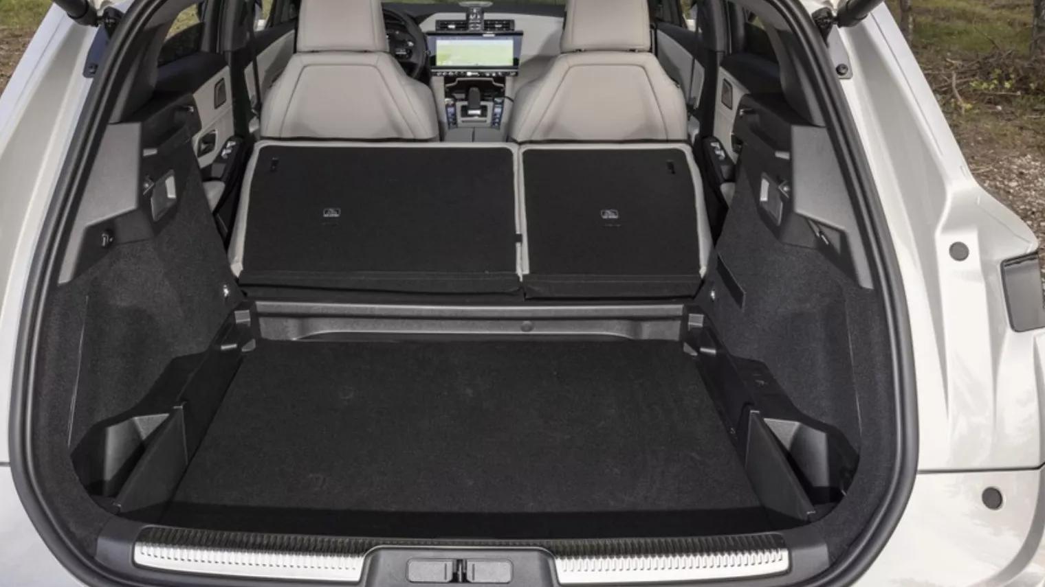 De DS7 heeft een buitenmaat van 4,60 meter. Zijn bagageruimte is lekker groot: 555 liter met de achterbank op z’n plek en als je de achterbank weg klapt heb je maar liefst 1.712 liter bagageruimte in de DS7. Je vindt er een dubbele laadbodem en een verstelbare vloer. De laadvloer is niet helemaal vlak. De laadkabel berg je op in een onhandig kleine tas. Overigens heb je twee ´vloerplanken´ in plaats van één. Als je de bovenste verplaatst kun je ´m beter thuislaten. In de DS7 is de beenruimte ook voor mensen van 1 meter 90 in orde. Je zit achterin wat hoger dan voorin omdat er een batterijpakket onder de bank schuilgaat dus de hoofdruimte schiet helaas net tekort.