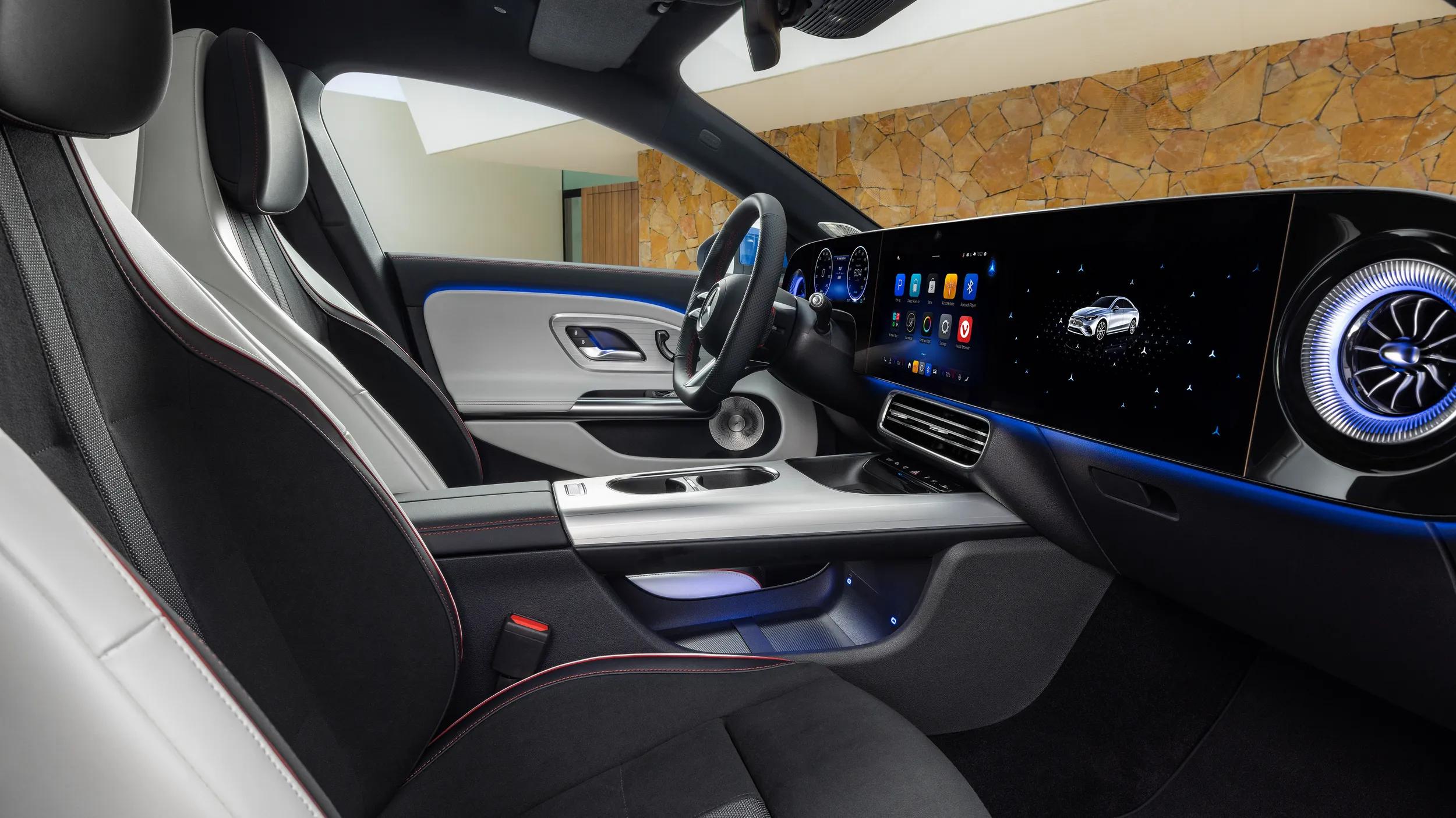 Het interieur van de CLA bestaat vrijwel volledig uit aanraakschermen, met alleen nog wat knoppen op het stuurwiel. Het infotainment draait op Google-software, die door Mercedes is doorontwikkeld. De toevoeging van artificiële intelligentie zorgt, dat je de CLA niet alleen kunt vragen waar je in den vreemde jouw favoriete drankje kunt drinken, maar ook of in dat etablissement bijvoorbeeld huisdieren welkom zijn.