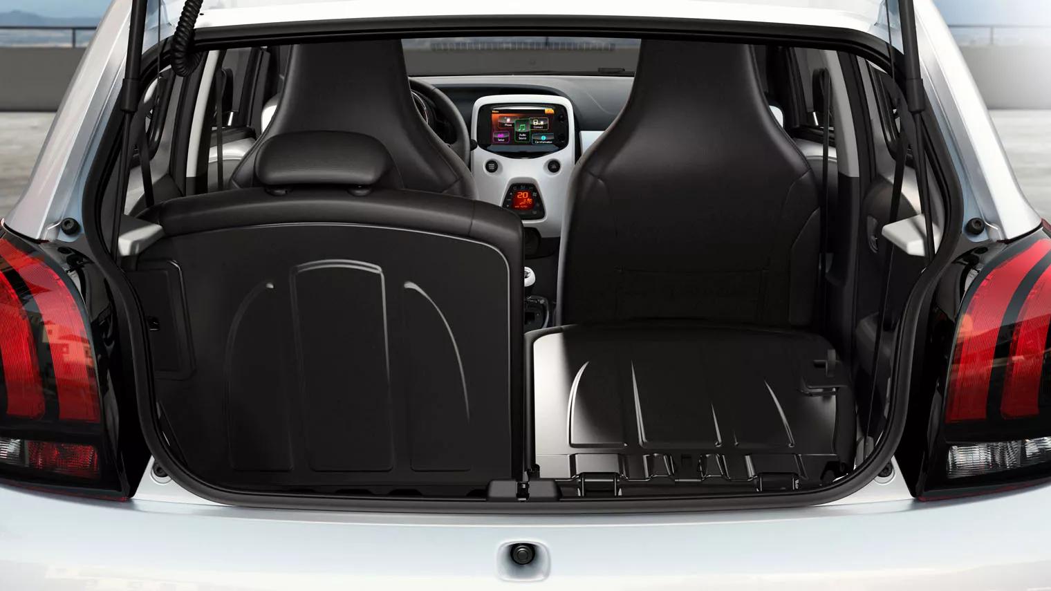 Met een lengte van 3.47 meter is de Peugeot een van de kleinste stadsauto’s die er in ons land wordt verkocht. Daar hoort een soortgelijke binnenruimte bij: op de achterbank kun je alleen de kinderen kwijt. De teller blijft steken bij twee stuks: meer gordels zitten er niet in. De ramen kunnen achterin niet naar beneden: het zijn klapruitjes, die alleen op een kier kunnen. De kofferruimte valt met minimaal 196- en maximaal 780 liter bescheiden uit. Klap je de rugleuning neer, dan ontstaat er geen vlakke laadvloer omdat een verstelbare bagagebodem ontbreekt. De tildrempel van de 108 is fors en de rugleuning van de achterbank is niet bekleed, waardoor je er al gauw een kras op maakt. Je opent de achterklep door middel van een drukknop bovenaan de bumper, die je bij vies weer geheid vieze handen oplevert. Wel handig zijn de hoedenplank die met de achterruit mee naar boven scharniert en de sleufjes aan weerszijden van de achterbank, die voorkomen dat de gordels in de verdrukking raken wanneer je de rugleuning terug klapt. Hoewel het binnenste van de Peugeot een mix is van plaatstaal en glimmende, harde kunststoffen, oogt het geheel speels en verzorgd. Een aanraakscherm, compleet met achteruitrijcamera en Apple CarPlay, tilt het interieur naar een hoger plan.