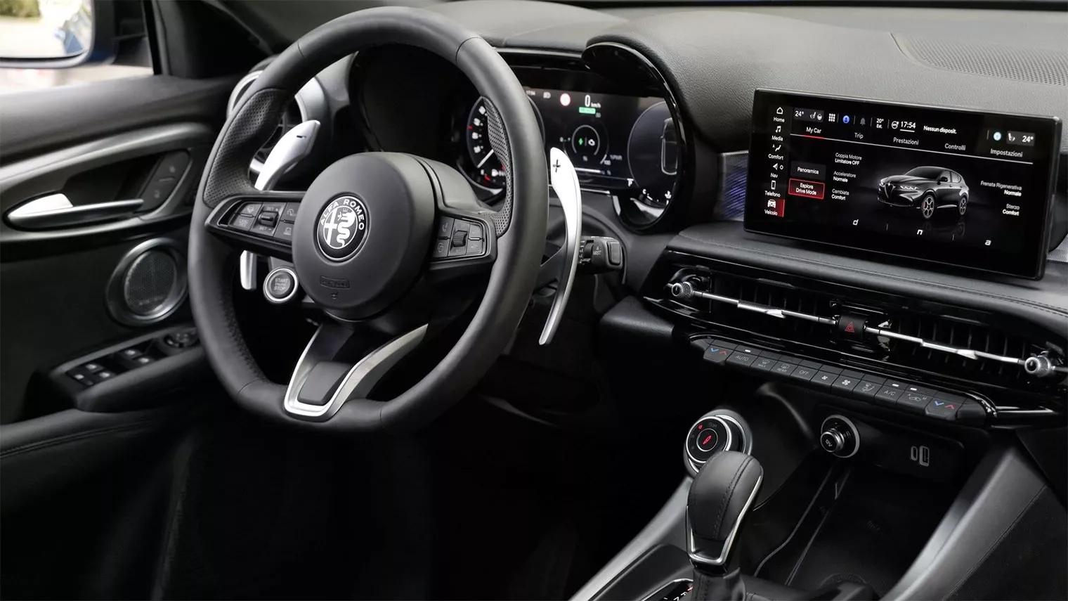 Die Alfa romeo Tonale deelt zijn platform met dat van de Jeep Compass. Wat betekent dat voor de binnenruimte? Welnu, het is niet bepaald de ruimste. De beenruimte achterin is weliswaar prima maar de hoofdruimte schiet te kort. Lange pubers hebben daarvan waarschijnlijk last. De ver naar voren stekende middentunnel zorgt er voor dat je in het midden achterin niet lekker kan zitten.. Sommige delen, zoals rond de deurgrepen, ziet er wat ‘goedkoop’ uit. Het moet aluminium lijken maar je ziet dat het plastic is. Aan de andere kant heb je juist die fraaie, wél echt uit aluminium vervaardigde versnellingsflippers en dat prachtige stuurwiel. Dat is dan weer heel erg Alfa, net als de meters. Dat is een moderne interpretatie van wat oude Alfa’s hadden. Het is nu een digitale projectie maar het voelt toch aan als de twee grote ronde klokken van weleer. Ze zijn goed afleesbaar Het infotainmentsysteem herbergt heel veel functies en is redelijk intuïtief te bedienen. Nadeel: er zit erg veel onder menu’s verstopt. Voordeel: het werkt allemaal razendsnel. En wat echt Alfa Romeo-waardig is; je kunt extra metertjes tevoorschijn toveren van bijvoorbeeld de turbodruk en de olietemperatuur. Overigens is er ook een rijtje fysieke knoppen voor de bediening van de airco. Er mag maximaal 1.800 kilogram aan de trekhaak. Verder heeft onze testauto een Rear Seat Reminder. Volgens de folder herinnert die de bestuurder bij het uitstappen eraan dat er mogelijk kinderen of huisdieren op de achterbak zitten. Alsof je dat zou vergeten!