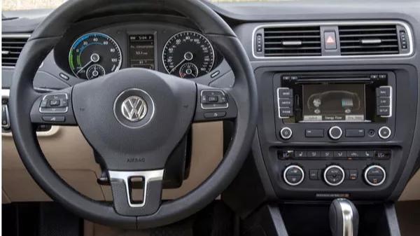 Je merkt onderweg eigenlijk nauwelijks dat je met een hybrideaandrijving van doen hebt. Het samenspel tussen elektromotor en benzinemotor verloopt heel soepel. Het grote pluspunt van de Jetta Hybrid is dat hij geen CVT versnellingsbak heeft zoals veel andere hybride-auto’s, maar de geweldig schakelende zeventraps DSG-bak. DSG staat voor Direct Shift Gear. Het zorgt er simpel gezegd voor dat schokloos en in milliseconden van versnelling wordt gewisseld. Sommige hybrides hebben een gerobotiseerde handbak en die voel je vaak nadrukkelijk schakelen. En bij hybrides met een CVT staat de benzinemotor vaak fiks te loeien tijdens acceleren. Het stuur- en weggedrag is goed. De Jetta Hybrid stuurt mooi precies en helt in bochten verrassend weinig over. De verleiding is daardoor groot de auto sportief te rijden want mede dankzij de elektromotor is er ook behoorlijk wat kracht voorhanden. Uiteraard komt dat het brandstofverbruik niet ten goede. Rij je de auto waarvoor hij bedoeld is, dan is hij heerlijk comfortabel en rustgevend. Het is keurig stil aan boord en de afstemming van vering en demping comfortabel. Alleen het remmen vraag gewenning. De auto remt steviger af op de motor dan je verwacht (om energie terug te winnen), waardoor je in het begin harder op de rem trapt dan nodig is. Een proefrit maken om dit zelf te ervaren is een must.De Volkswagen Jetta van binnen