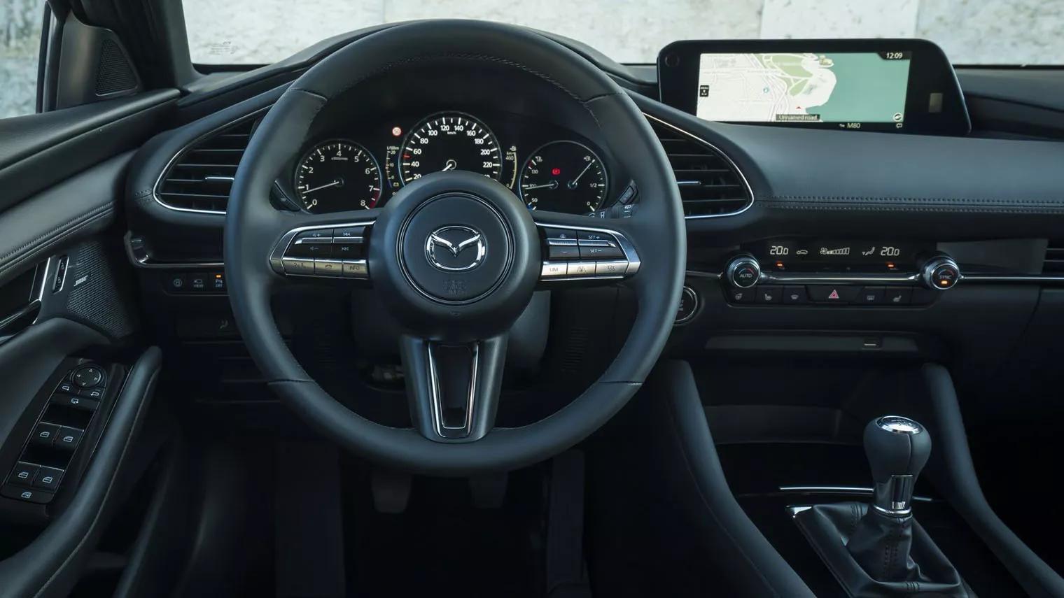 Wat opvalt zodra je achter het stuur gaat zitten is dat alle gebruikte materialen van een hoge kwaliteit zijn voor een auto in deze klasse. Overal voel je zachte bekleding. De ergonomie is prima en je kunt het stuurwiel opvallend ver naar je toe halen. Verder valt de plek van de ventilatieroosters op, direct naast de instrumenten en boven het dashboardkastje. Mazda maakt geen gebruik meer van een aanraakscherm maar gebruikt nu een druk-draaiknop in combinatie met enkele druktoetsen. Werkt prima. Dat 8,8 inch grote scherm staat trouwens ver naar achteren, bovenop het dashboard. Heel goed, het komt de afleesbaarheid ten goede. Verder oogt het dashboard heel clean. Je vindt alleen knoppen voor de klimaatregeling en de stoelverwarming.