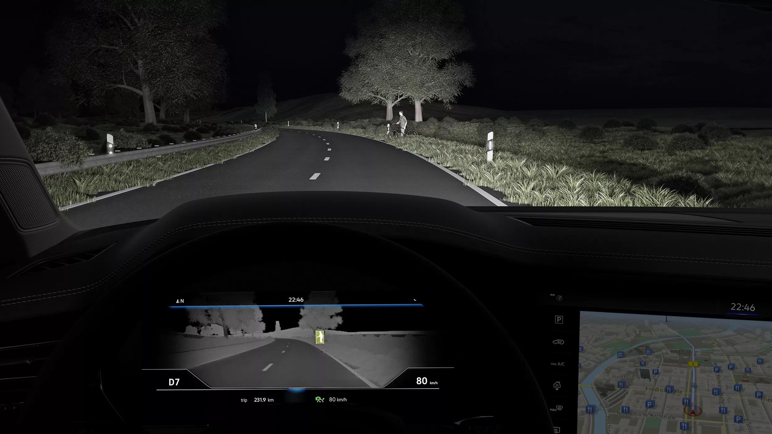 De testauto is uitgerust met nightvision (kost € 2.000). Dat omvat een infrarood camera die 130 meter vooruit kijkt in het donker of in dichte mist. Op je instrumentenpaneel zie je wat je met het blote oog (nog) niet kan zien, zoals voetgangers of overstekend wild.