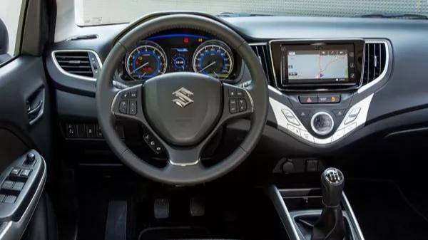 De Baleno mag dan in het vaarwater van de Swift zitten, het zijn twee compleet verschillende auto's. Dat blijkt al uit de styling, maar komt ook in het rijgedrag naar voren. Waar de Swift van Suzuki een sportief onderstel heeft meegekregen, is de Baleno eerder op comfort ingesteld. Je moet als bestuurder wel alert zijn op korte oneffenheden in het wegdek, want daar stuitert de compacte gezinsauto nadrukkelijk overheen. In de Baleno ben je toch al druk aan het sturen. De rechtuit-stabiliteit is teleurstellend. Je voert continu kleine stuurcorrecties uit; een typische Suzuki-kwaal, waar ook de Swift en de Vitara onder lijden. Op lange ritten word je daar behoorlijk moe van. Onder de kap van onze testauto lag een 90 pk sterke viercilinder benzinemotor die we al kennen uit de Swift. Ditmaal was de krachtbron gekoppeld aan een traploze automaat. Met de motor zelf is weinig mis, zeker omdat de Baleno is gebouwd op een nieuw, lichtgewicht chassis. Daardoor krijgt de viercilinder eenvoudig gang in de compacte gezinsauto. In combinatie met deze CVT reageert hij echter overdreven happerig op het gas. Daarnaast maakt de transmissie de Baleno nóg rumoeriger; het blok is van zichzelf namelijk al niet stil. Vaste verzetten ontbreken bij een CVT; de automaat kiest zijn versnelling op basis van de druk van jouw gasvoet. Voeg je in of passeer je een vrachtwagen, dan gaat dat gepaard met (onnodig) veel toeren. Verder hebben we wat aan te merken op de zitpositie van de Suzuki. De zittingen van de voorstoelen zijn kort en hoewel de bestuurdersstoel in hoogte verstelbaar is, kijk je met een lengte boven de 1.90 meter tegen de zonneklep aan. Het helpt ook niet dat de voorruit van de Baleno bescheiden afmetingen heeft. Het dak loopt ver door, waardoor het aflezen van een verkeerslicht moeite kost. Ook over je schouder laat het zicht in de Suzuki te wensen over. Een unicum in deze klasse is de adaptieve cruise control waarvan je de Japanner kunt voorzien. De radar waarmee de cruise control functioneert, waarschuwt je meteen voor een dreigend ongeluk en begint alvast met remmen wanneer een aanrijding onvermijdelijk is.De Suzuki Baleno 1.2 High Executive CVT van binnen