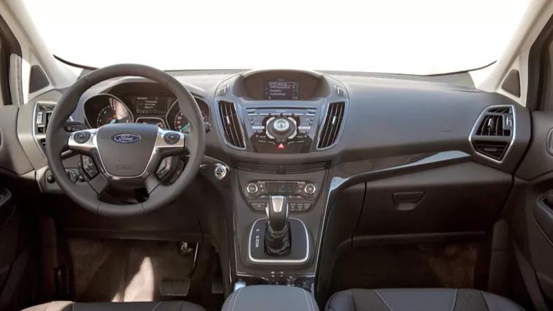 Met die betaalbare, voorwielaangedreven basis-Kuga hebben we helaas nog niet kunnen rijden. Voor deze eerste autotest was alleen de 163 pk sterke dieselversie beschikbaar, mét vierwielaandrijving. En die kost, in luxe Titanium-uitrusting € 46.780, of zelfs € 50.405 voor de versie met PowerShift automaat. Een heel bedrag, maar reken maar dat zo’n 2.0 TDCi AWD uitstekend rijdt. De topsnelheid ligt net iets onder 200 km/h en versnellen van stilstand naar 100 km/h kost rond de 10 seconden. Het AWD-systeem werkt prima. De aandrijfkrachten worden voornamelijk naar de voorwielen gestuurd, maar als de omstandigheden daarom vragen gaat een deel van de aandrijving ook naar de achterwielen. Op een display op het dashboard kun je de krachtenverdeling zien. Een stukje ‘off road’ met veel kuilen, keien en hobbels bleek een peulenschil voor de Kuga. En op de weg, bij hoge snelheden, zorgt het AWD-systeem voor meer grip in de bochten en betere handelbaarheid. Verder valt op dat de Kuga erg stil is, wat betreft weggeluid en windgeruis.De Ford Kuga van binnen