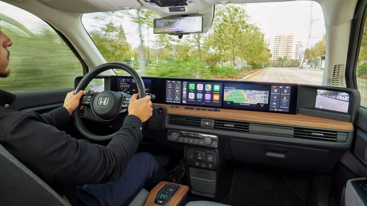 De opwinding rond de Honda e wordt niet alleen verklaard door het futuristische uiterlijk van de stadsauto, maar ook door hoe het wagentje er van binnen uitziet. De bestuurder kijkt namelijk uit op een volledig digitaal instrumentarium, dat zich inclusief de monitors van de cameraspiegels uitstrekt over de volledige breedte van de auto. Jouw bijrijder heeft minstens zoveel inspraak op wat er op die schermen gebeurt: met een druk op de knop kun je bijvoorbeeld de navigatiekaart en de radiobediening van plek laten wisselen. Onderaan de middenconsole bevinden zich een volwaardig stopcontact en een heuse HDMI-aansluiting, zodat je tijdens het opladen van de elektrische auto naar de programma’s van een streamingdienst kunt kijken. En als je dat niets vindt, zit er in het bedieningsmenu een functie verborgen, waarmee je de klokkenwinkel omtovert in een virtueel aquarium. Het wonderlijke stuk technologie wordt standaard meegeleverd op de e, wat mede de hoge aanschafprijs verklaart. Zoals eerder al gezegd, heeft Honda zich voor het interieur laten inspireren door de nieuwste woontrends. In het plafond vind je spotjes zoals thuis in de keuken, her en der keren smaakvolle houtstrips terug en de gordels zijn niet zwart, maar bruin van kleur. De gebruikte materialen ogen niet alleen fraai, maar zijn ook plezierig om aan te raken. Minder aangenaam is de beperkte hoofdruimte op de achterbank: wie langer is dan gemiddeld, zit met gebogen hoofd achterin. De achterpassagiers moeten het zonder ventilatiemogelijkheid stellen, maar hebben wel twee stroompunten tot hun beschikking. Met minimaal 171- en maximaal 863 liter houdt de bagageruimte niet over. Bijzonder: de achterbank is alleen in zijn geheel neerklapbaar. Je beschikt echter wel over een vlakke laadvloer.